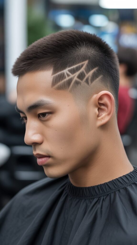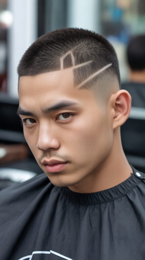 A simple buzz cut is given an edgy twist with this small detail. It makes their facial features stand out while keeping everything neat and tidy, which is very appealing to Asian men.