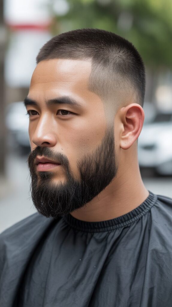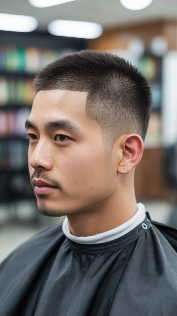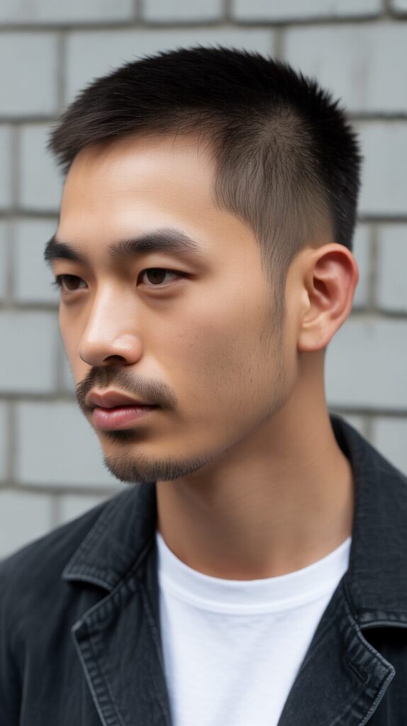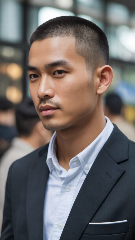 A thick buzz cut enhances the fullness and health of Asian men’s hair.