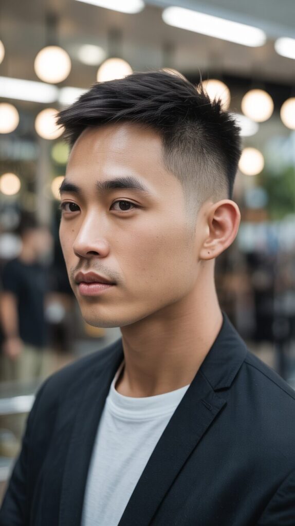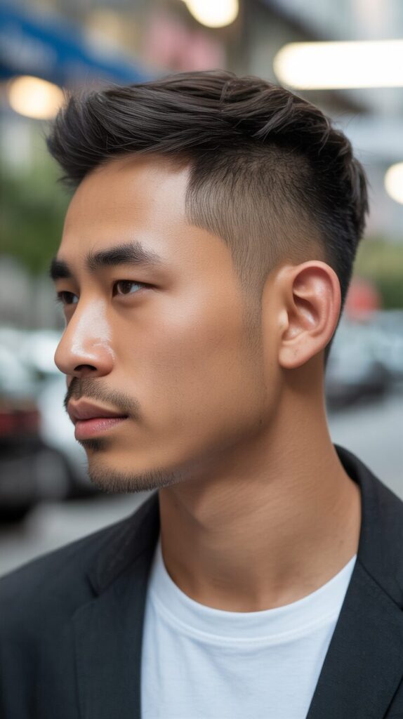 With its contrast and sharpness, it’s a bold and stylish mix. This style highlights Asian men’s face shapes and keeps a polished, modern look.