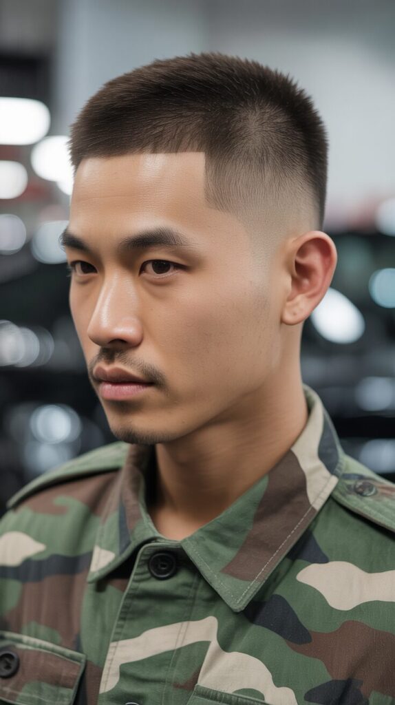 Taking inspiration from military styles, this haircut offers a bold look. In addition to Asian faces, it works well on many other faces as well.