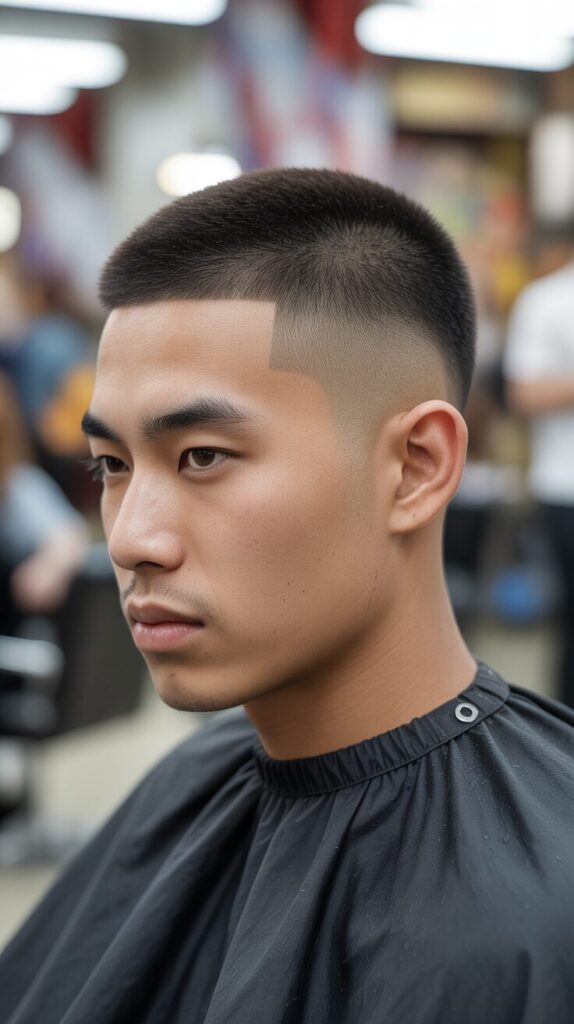 In the buzz cut fade, short hair on top is blended with gradually faded sides for a modern, sleek look. It’s clean, fresh, and suitable for Asian men who love the balance between classic and trendy.