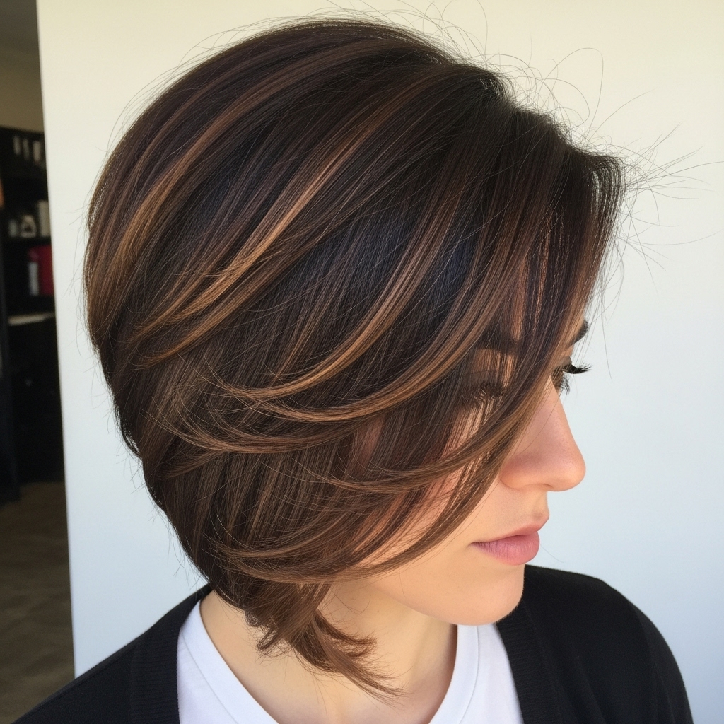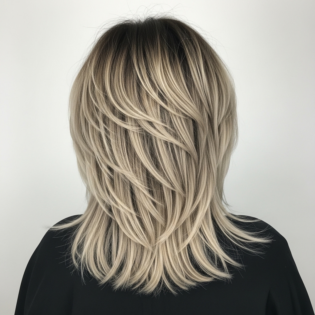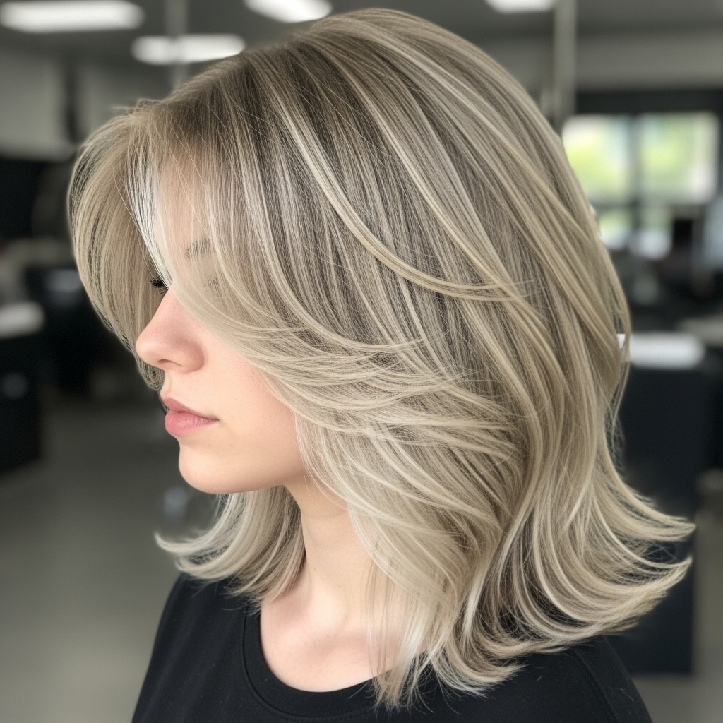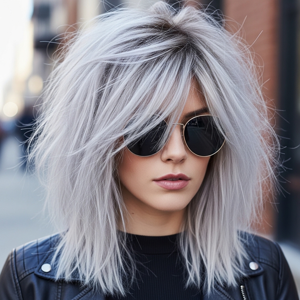 Using platinum balayage to highlight every layer creates a striking contrast. Light tones emphasize texture and shape, enhancing the haircut’s appeal. This style suits confident women who enjoy bold, high-impact looks. Proper tone keeps the color clean and modern. Layered cuts balance brightness with structure and control.