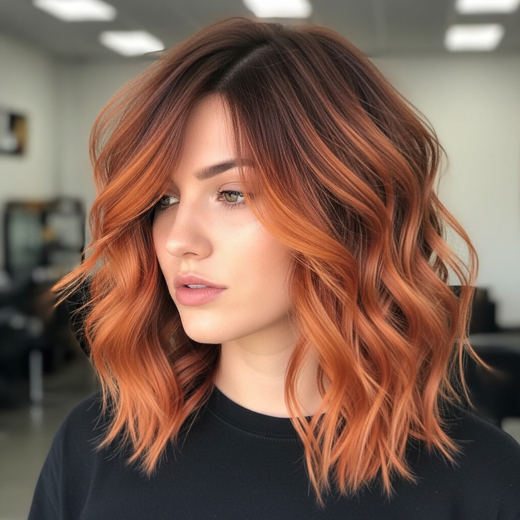 The wolf cut’s textured ends are enhanced by copper balayage, which highlights each layer and adds energy and dimension. This style is ideal for women who want a bold but natural-looking color change. The haircut complements wavy and curly textures particularly well. It is dynamic, stylish, and fashionable.