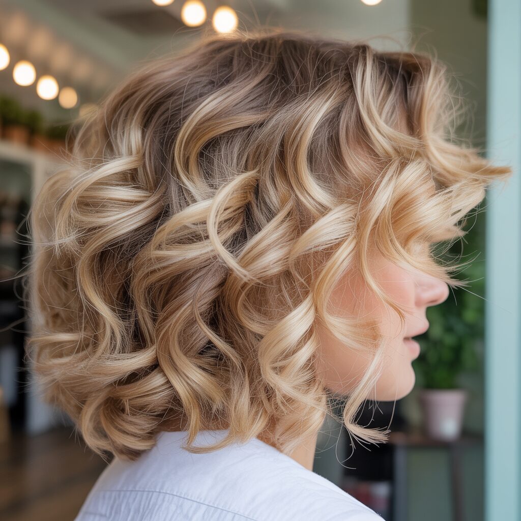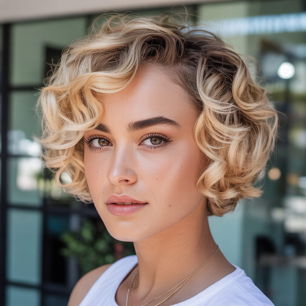 A cropped or curly bob styled with blonde highlights can add dimension to short curls, preventing a flat appearance, highlighting texture and volume. Styling looks intentional, sleek, and stylish. Ideal for cropped or curly bob styles with short curls.