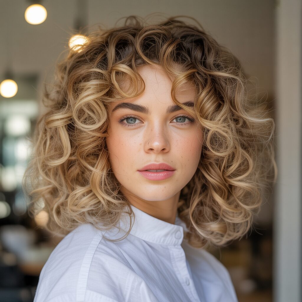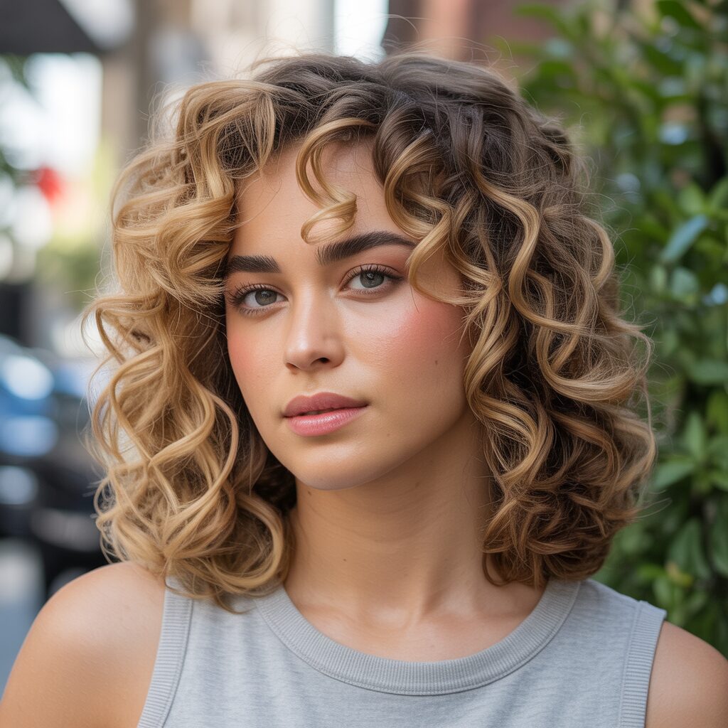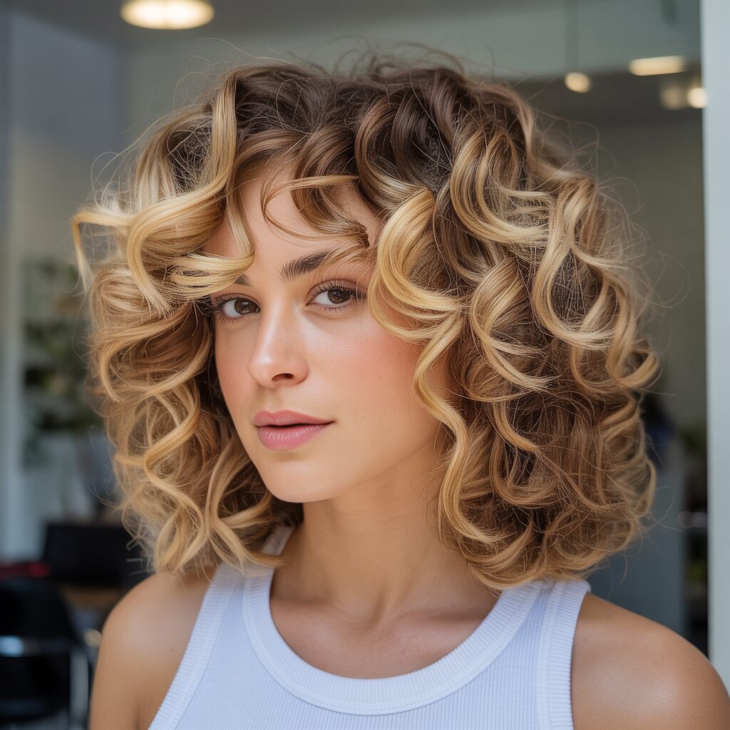 Highlights that frame your face brighten your features immediately, while lighter blonde pieces soften the shape of your face. This technique attracts attention to your eye-catching curls near the front and brings out their natural beauty. It is a small change that makes a big difference.