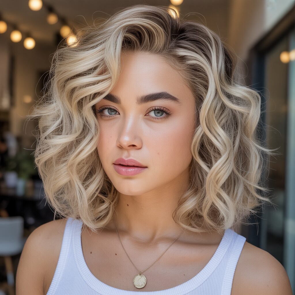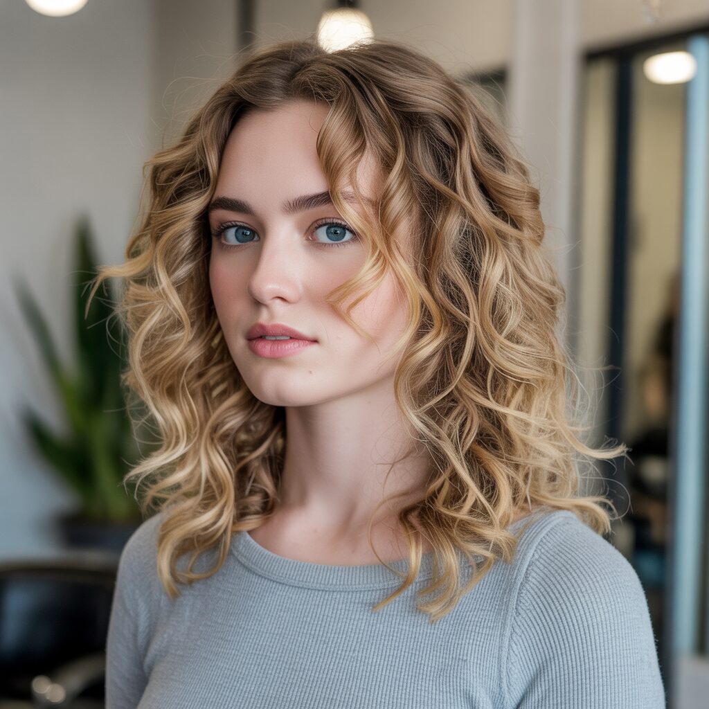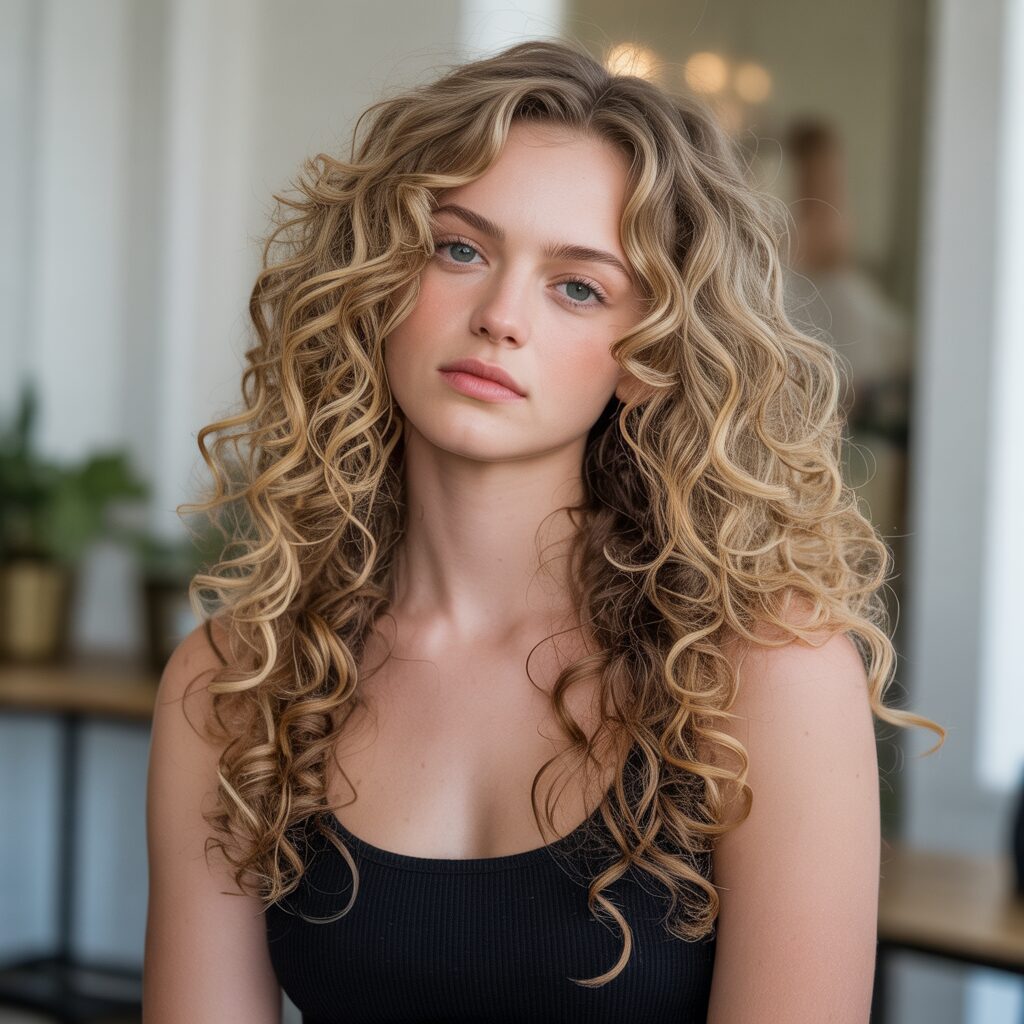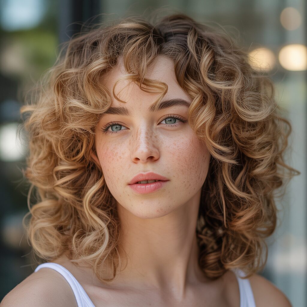 Highlights that frame your face brighten your features immediately, while lighter blonde pieces soften the shape of your face. This technique attracts attention to your eye-catching curls near the front and brings out their natural beauty. It is a small change that makes a big difference.