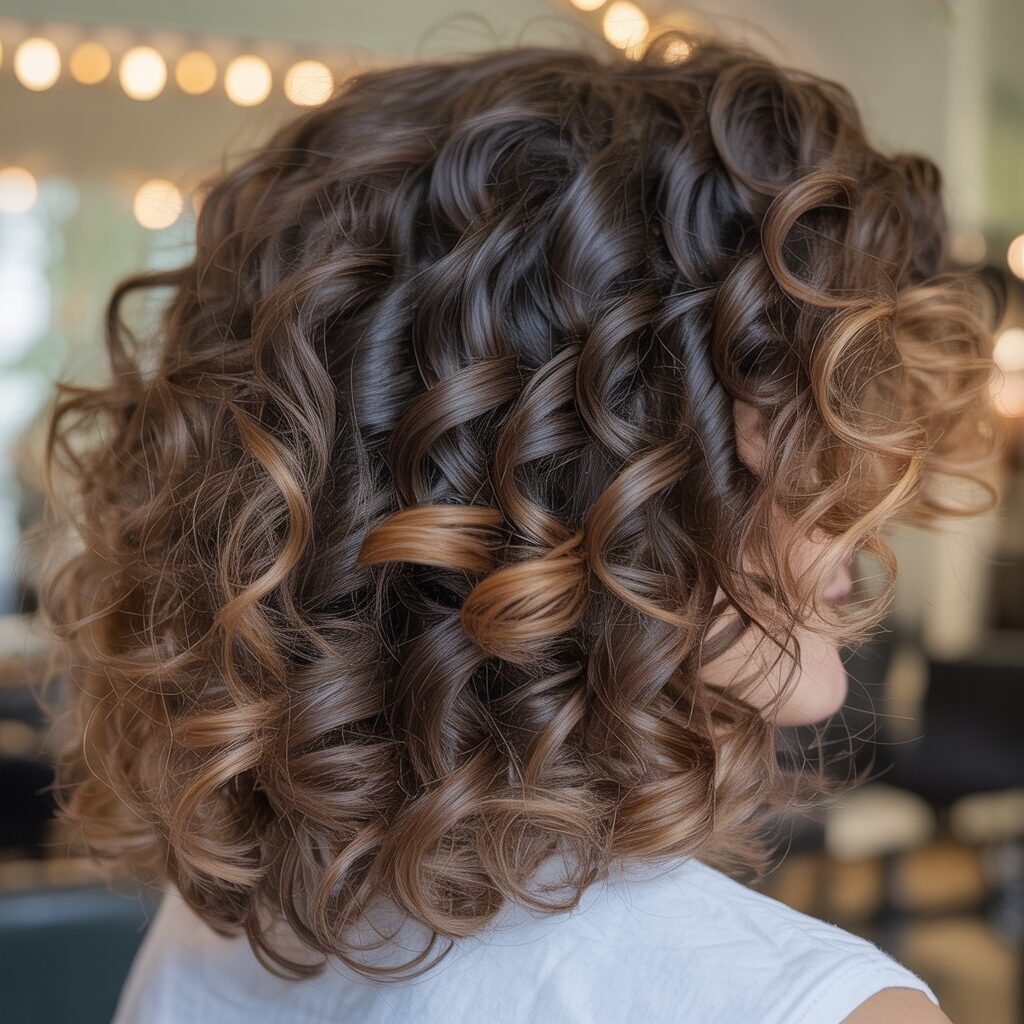 In this hairstyle the layers and highlights work perfectly together. Blonde tones enhance the curl shape while layered curls add movement and a lively look. The style looks dynamic and modern, perfect for today’s trendy haircuts.