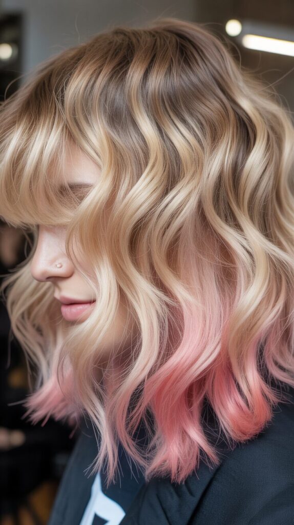 It is a medium blonde wolf cut that incorporates two distinct shades — brown and light pink — to add a sense of joy. The brown highlights can be clearly seen on the top layers and crown of the hair, while the pink highlights can only be seen on the lower layers. There is an edgy and playful vibe to the overall wolf cut because of the curtain bangs.