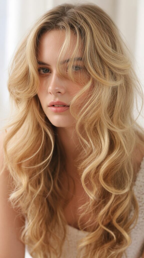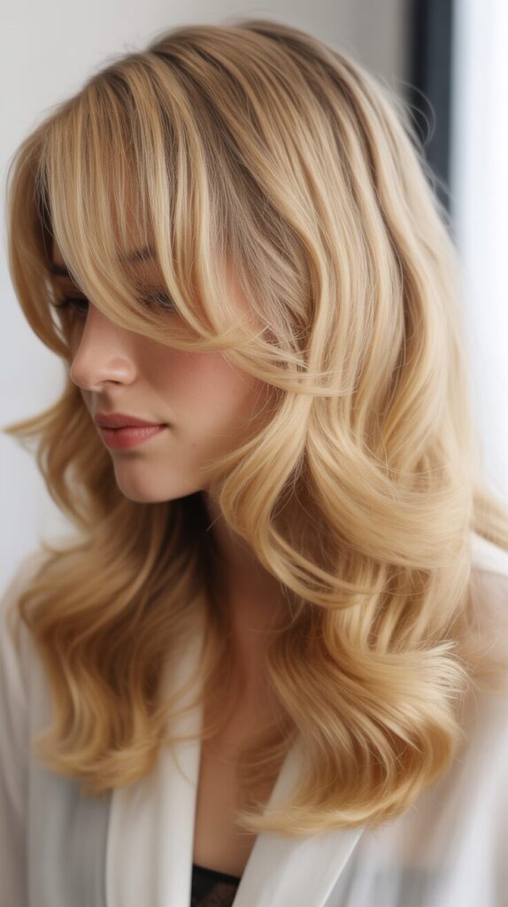 13. Long Blonde Wavy Wolf Cut With Extended Bangs