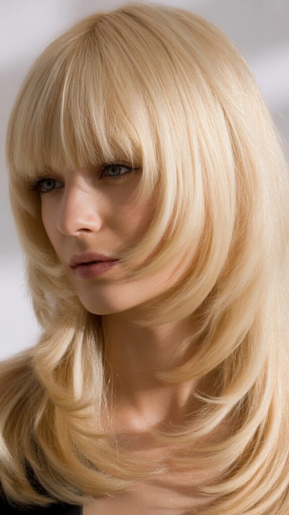 14. Long Blonde Layered Wolf Cut With Blunt Bangs