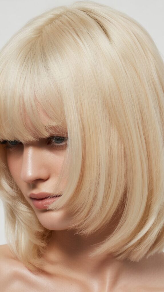 9. Bleached Blonde Medium Wolf Cut With Straight Bangs