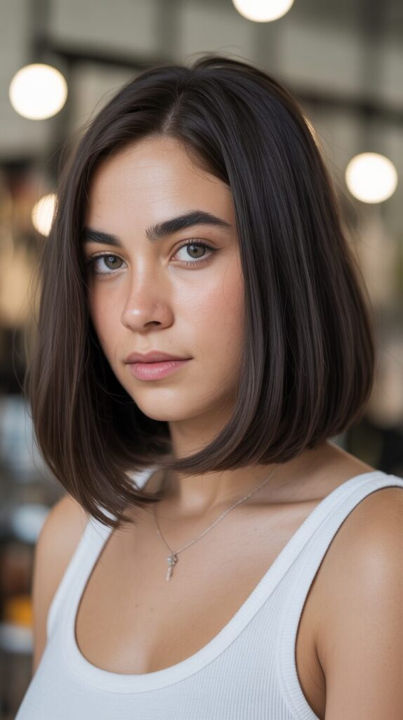 An A-line bob offers a clean, sharp shape. Longer front pieces help frame the face, while shorter back sections reduce heaviness. Thick hair looks great with this cut. It works best with straight or blow-dried hair.