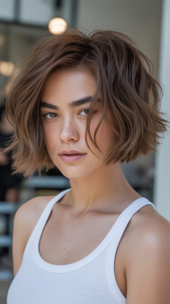 Hair with textured bobs breaks up the density of thick hair. Choppy layers create airflow and softness. This haircut looks contemporary and effortless. It avoids the boxy appearance thick hair can develop.