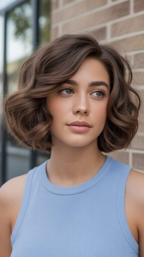 A bob style with wavy curls works beautifully with thick hair texture. The layers help shape natural waves. The style looks relaxed and effortless. The hairstyle avoids puffiness by cutting the hair correctly. It enhances movement and dimension. The styling looks natural and soft. A classic style for a casual look.