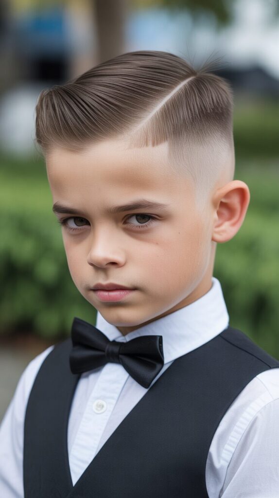This cut gives a clean and classic look with long hair swept back smoothly. It feels a bit formal, but still fun, especially for boys who like a grown-up vibe. If he wants to look sharp for parties, pictures, or any other occasion, this is the perfect outfit.
