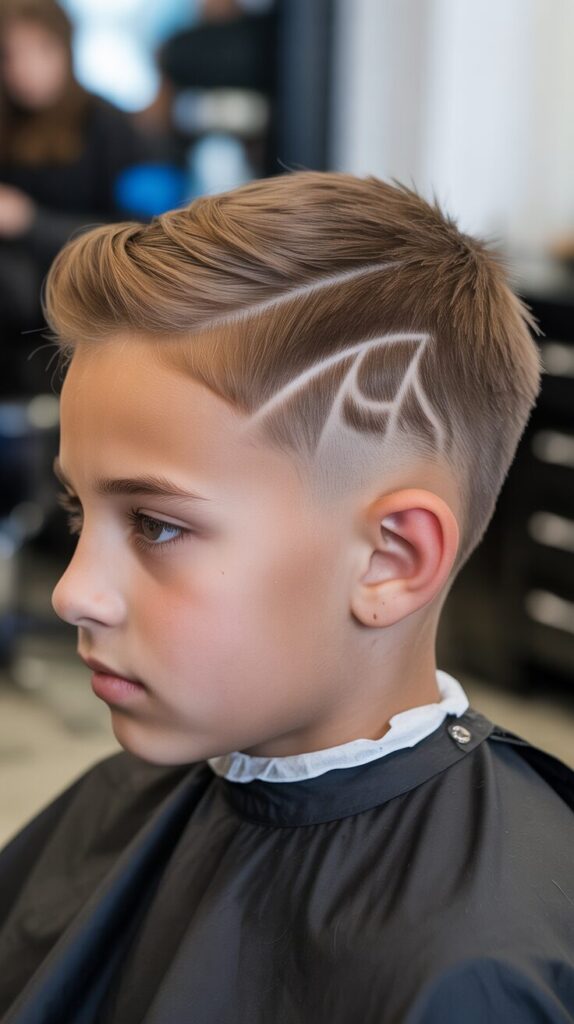 In this haircut, longer hair on top is blended with a clean side part and faded sides. Kids love the shaved design along the fade, adding a creative twist.