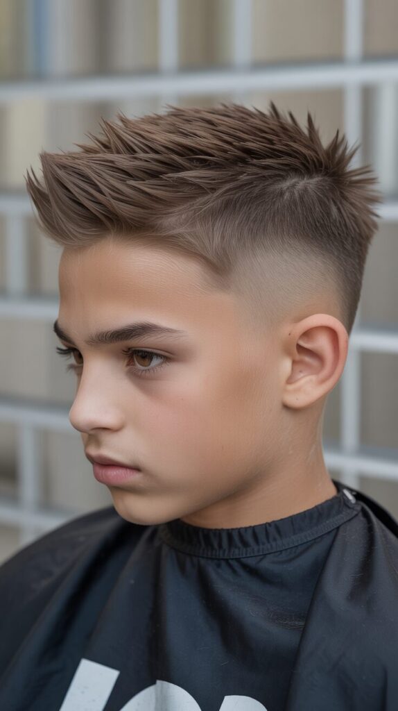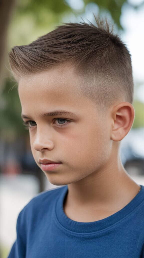 Short spikes on top are complemented by clean, buzzed-down sides. The style looks cool without requiring much time, which is perfect for boys who are always on the move.