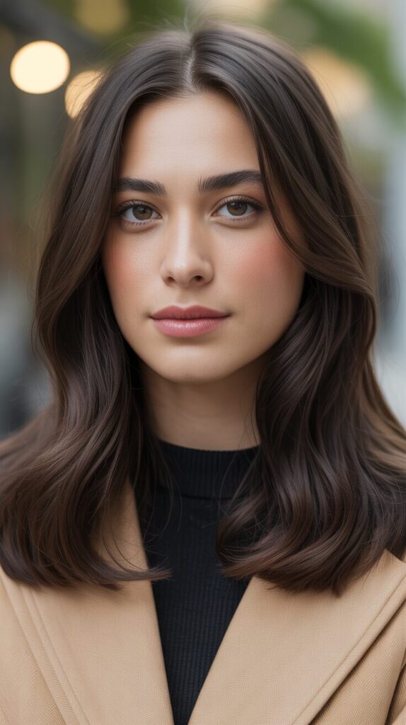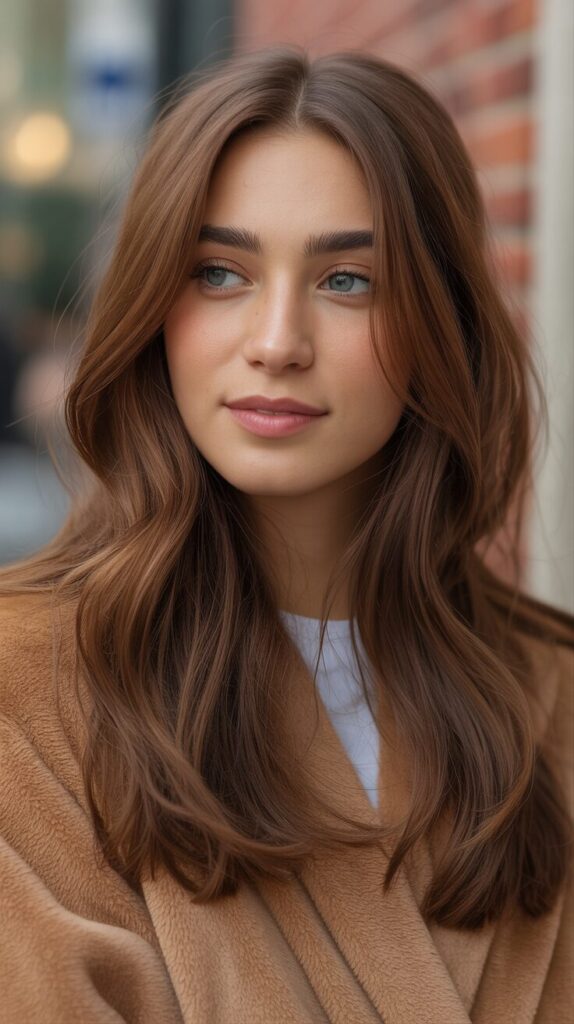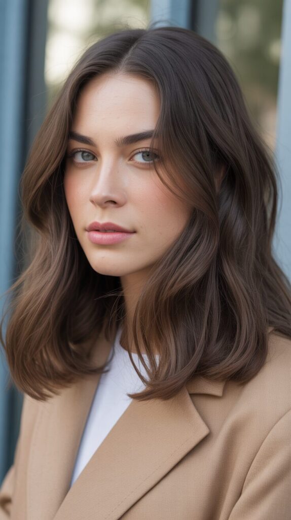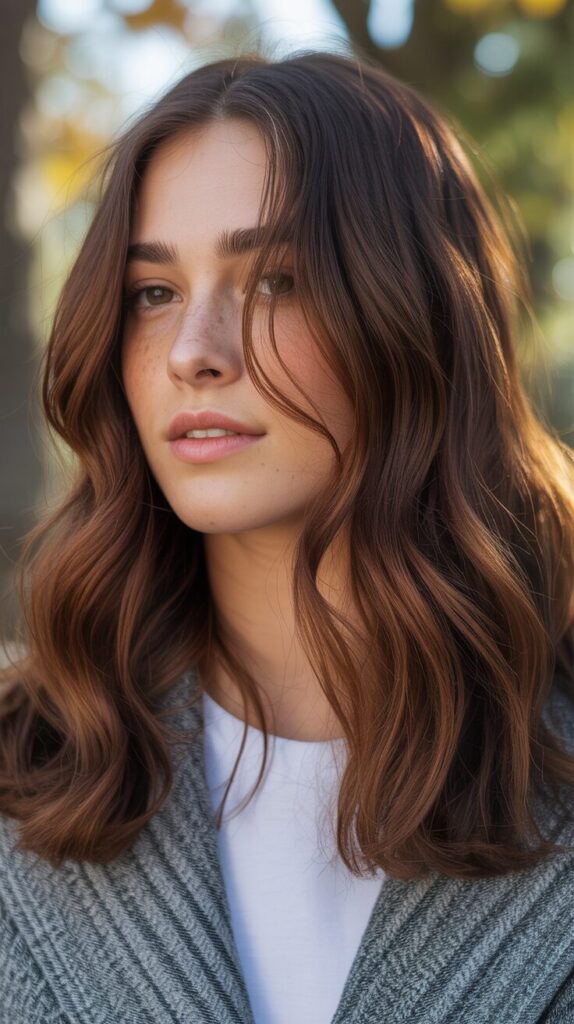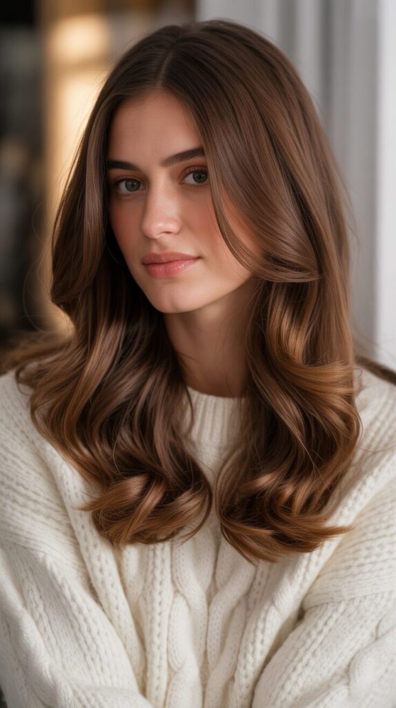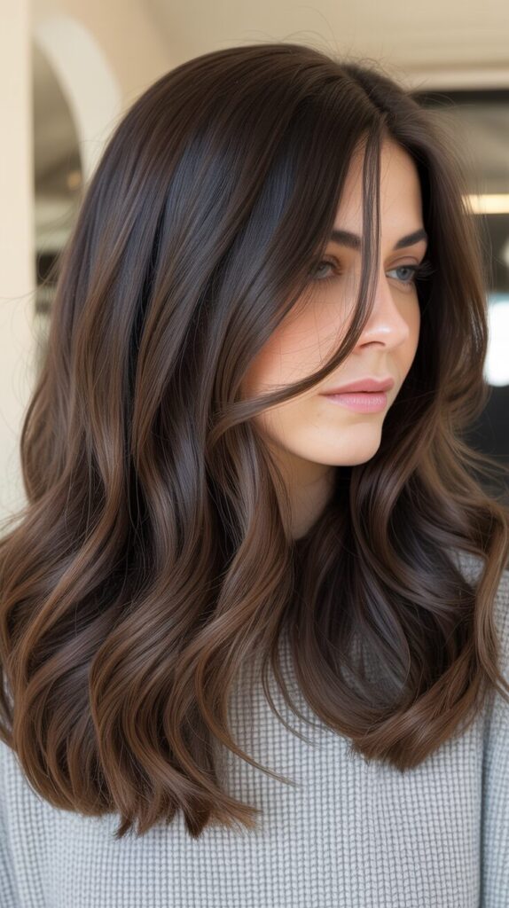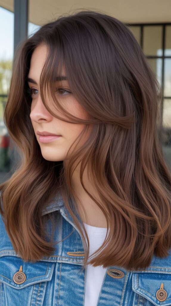 This look suits fall layers and waves well. Maintenance is manageable. Perfect for adding subtle brightness. A balanced and flattering style. Adding highlights adds a touch of dimension to chocolate brown hair. They prevent the color from looking heavy. Soft highlights enhance texture and movement.