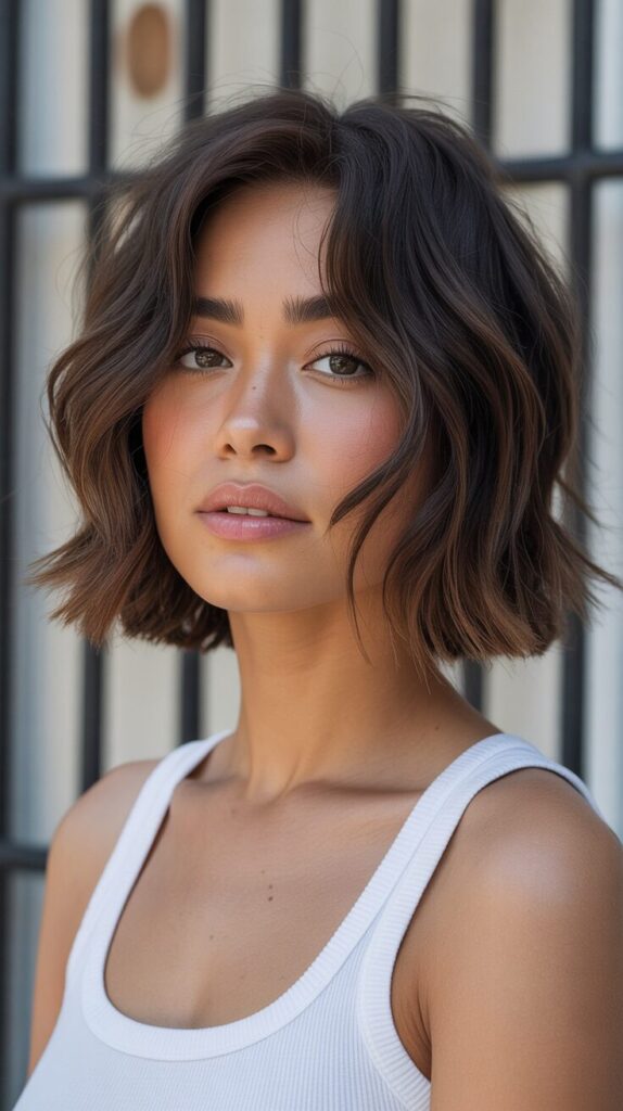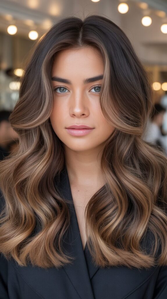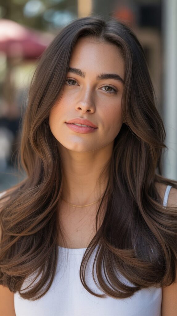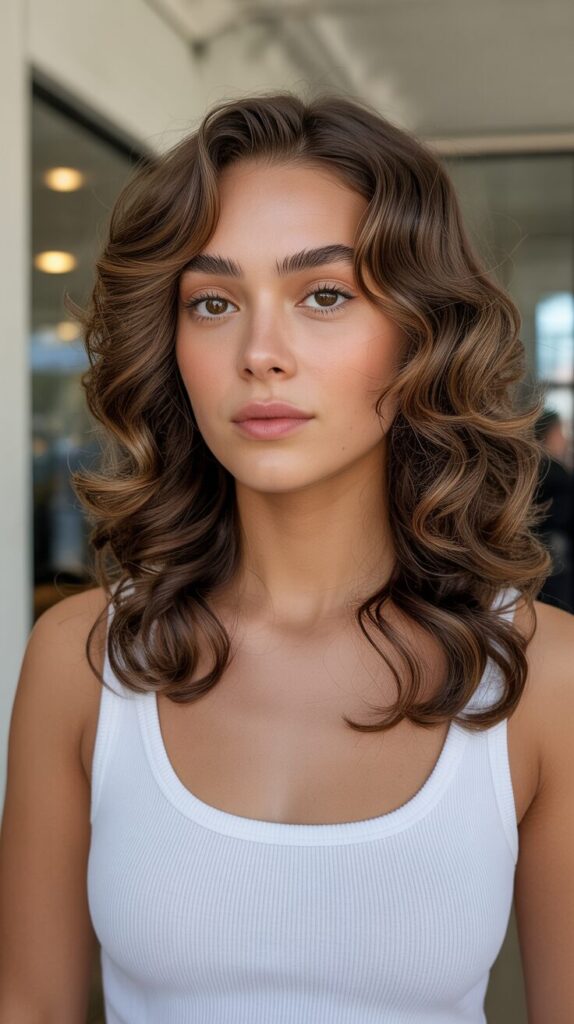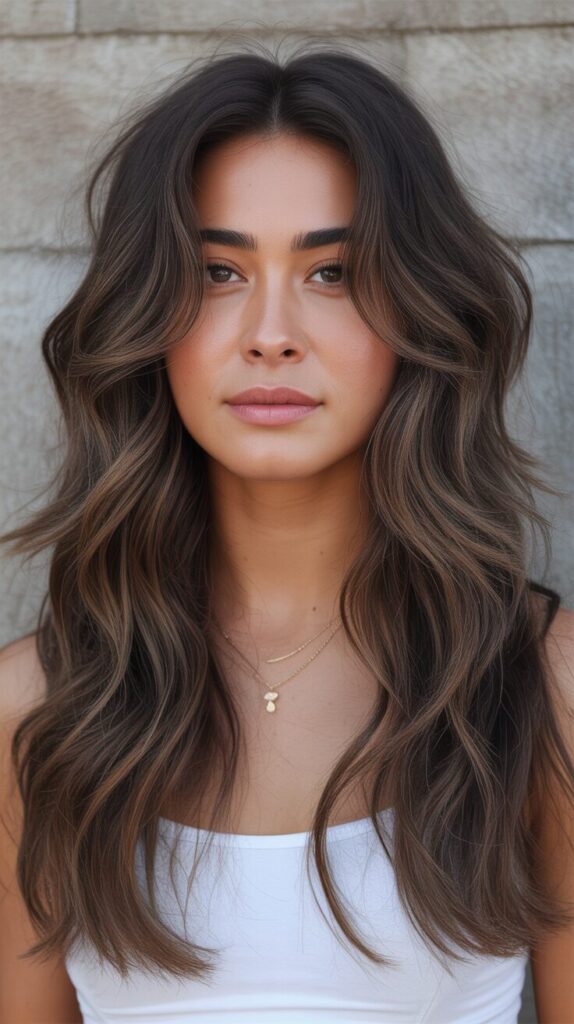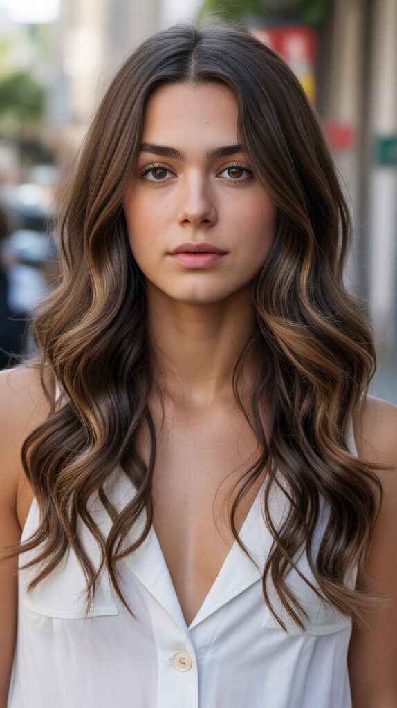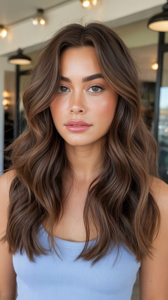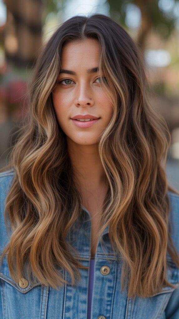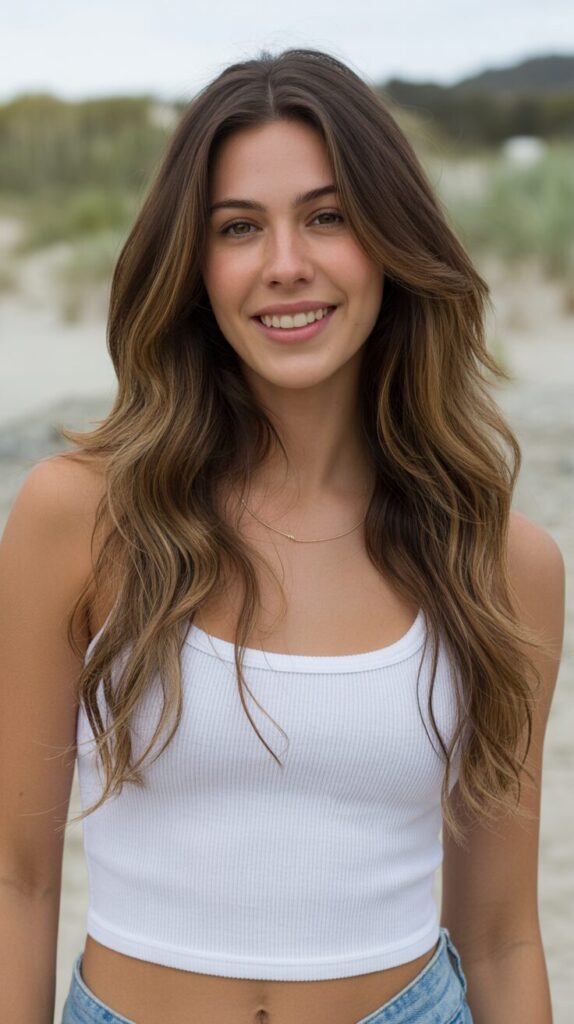 There is no better way to capture the essence of coastal beauty than with California Brunette With Long Beachy Waves, a style that effortlessly captures the easygoing vibes of a beach day.