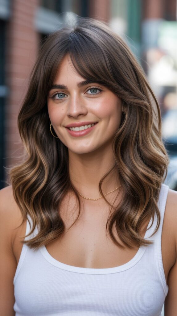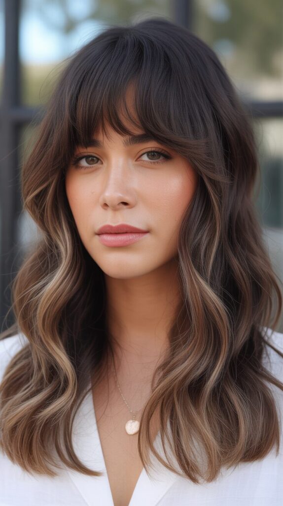 It’s time to elevate your look with California Brunette Balayage With Bangs, where the artful blend of colors and fringe creates a striking and sophisticated appearance that’s truly perfect for any occasion.