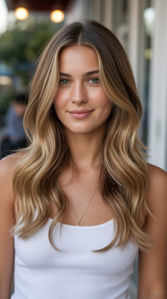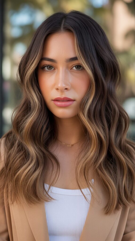 Under the California sun, you can let your hair radiate warmth and dimension with Long Wavy Sun-Kissed Balayage. Your hair will radiate warmth and dimension from roots to ends.