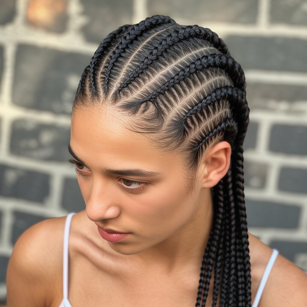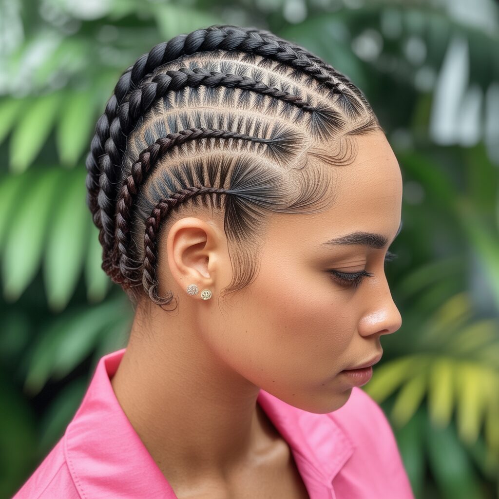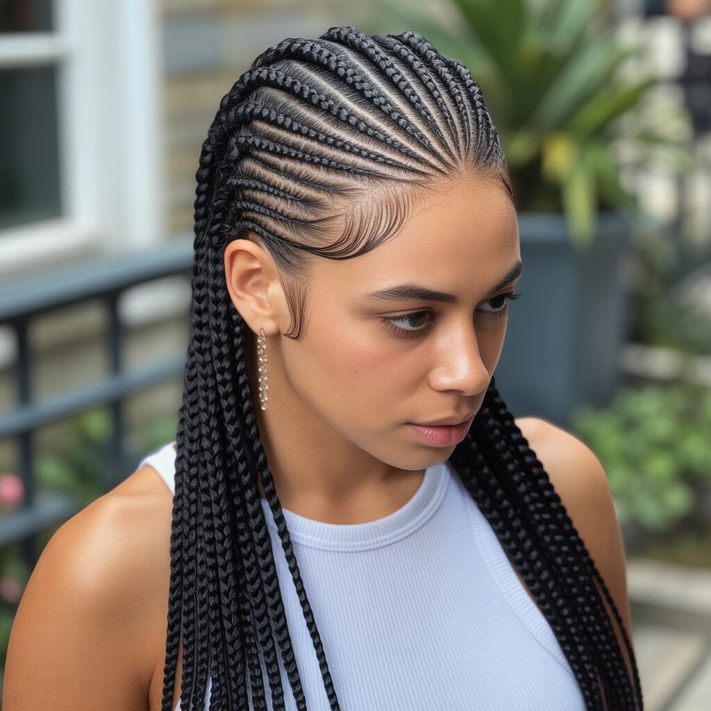 Having side-parted cornrows adds softness to your look. It changes the usual cornrow pattern and frames the face beautifully. This style feels less structured and more casual, which is perfect for everyday use.
