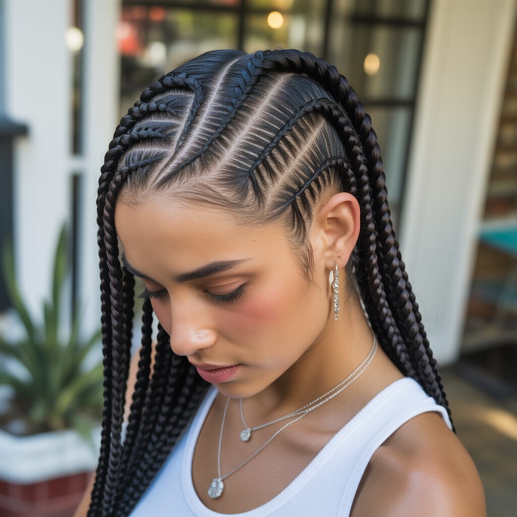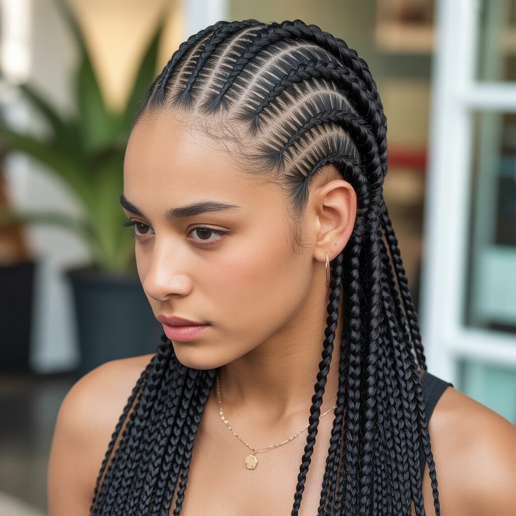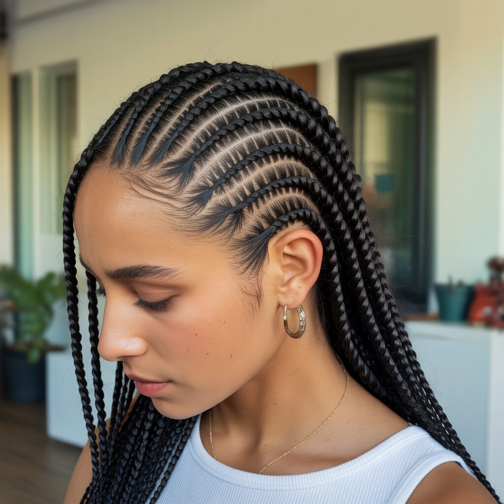 Having side-parted cornrows adds softness to your look. It changes the usual cornrow pattern and frames the face beautifully. This style feels less structured and more casual, which is perfect for everyday use.
