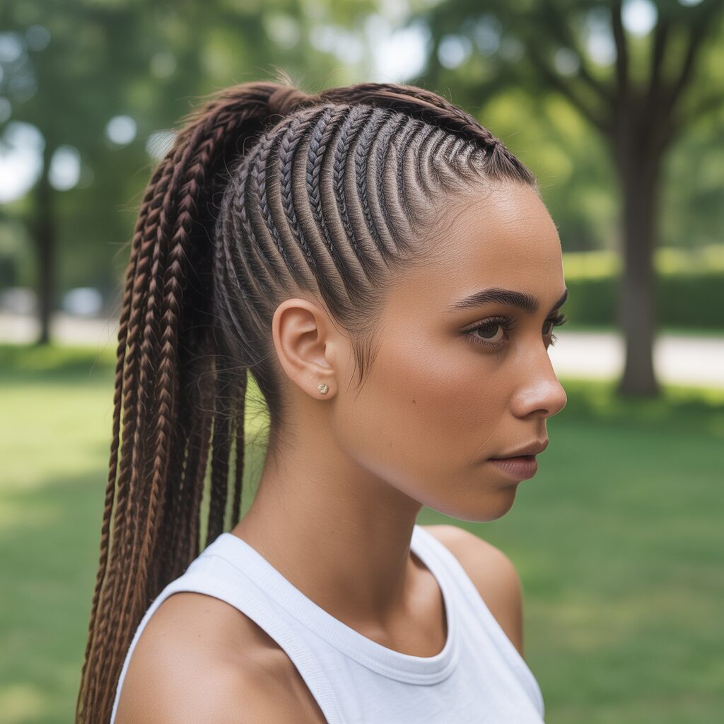 The simple cornrows leading into a ponytail look sleek and stylish. The style lifts hair away from the face, it’s practical for active days, and the ponytail adds movement to the style. It’s a sporty yet fashionable option.