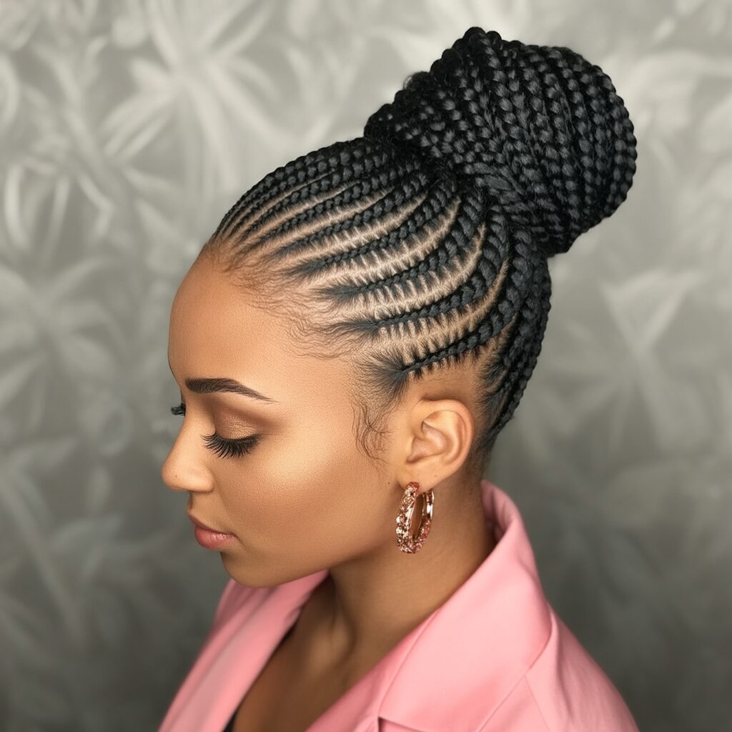 If you decide to wear your cornrows in a bun, it looks elegant and tidy because the braids are neatly gathered at the crown or nape of your neck. This keeps the hair secure and off your face. This style is ideal for work or formal occasions as it looks classy and polished.
