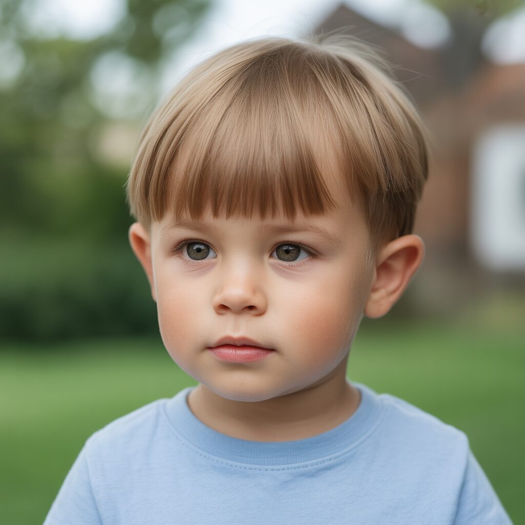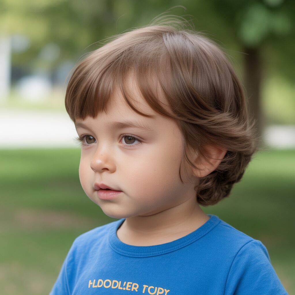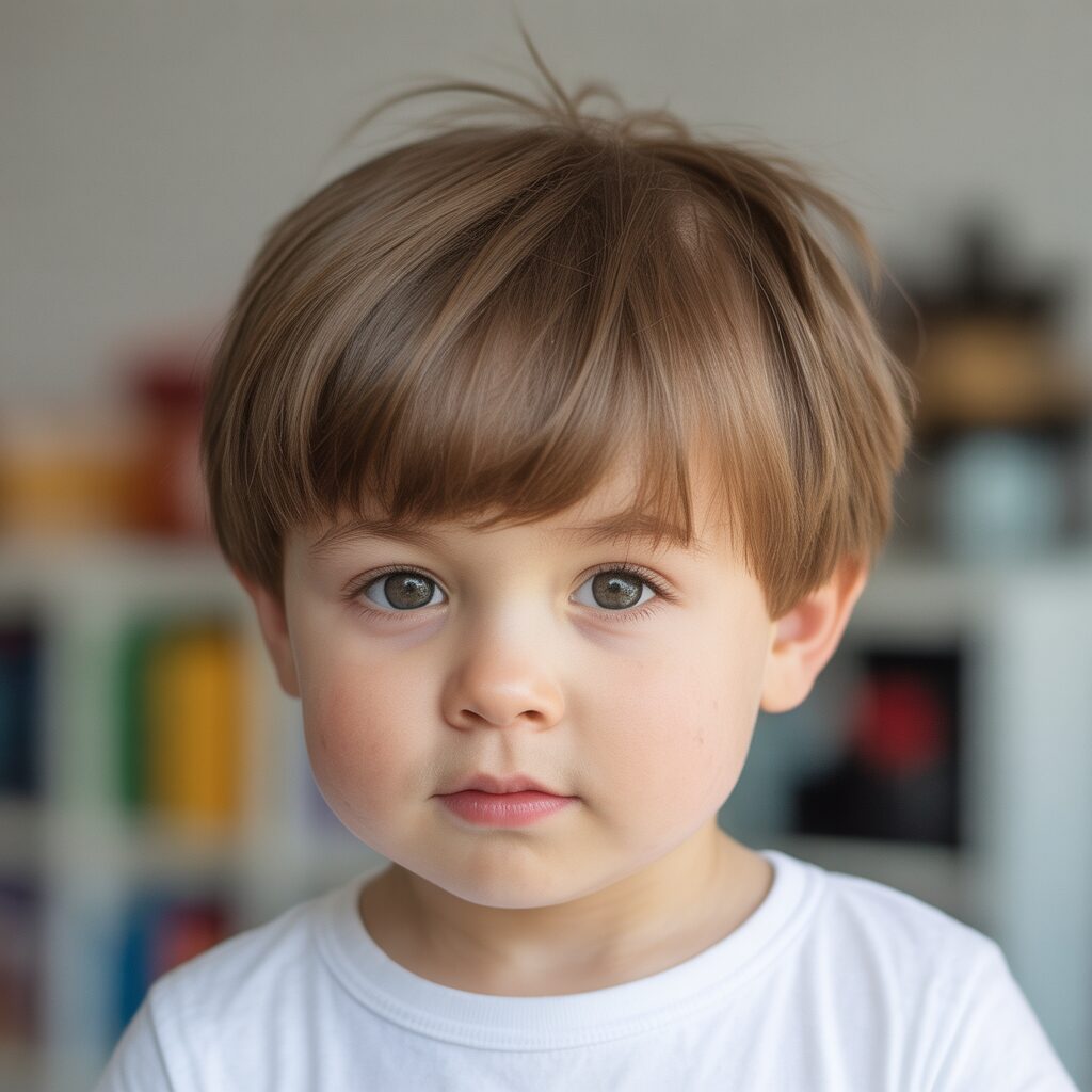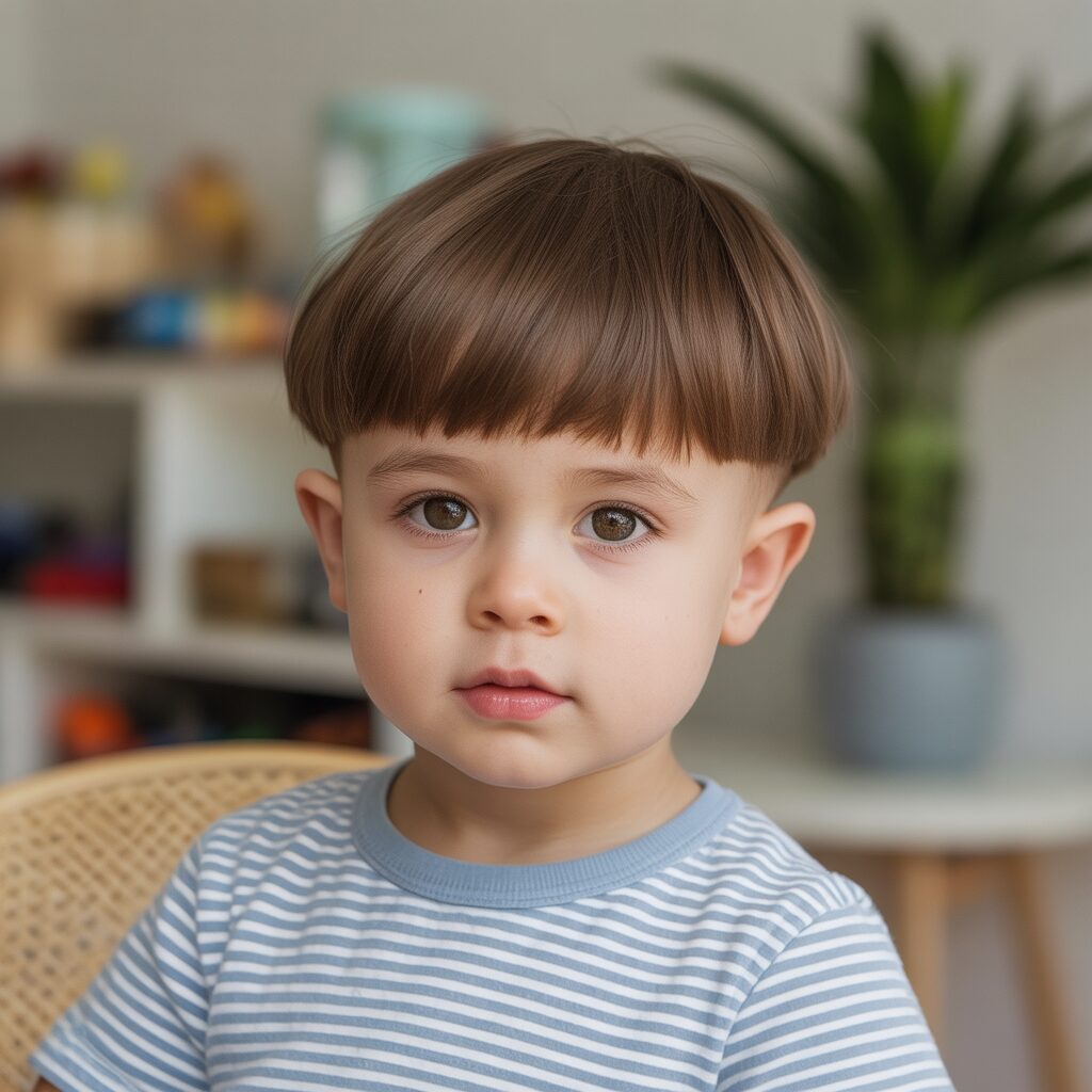A short fringe helps frame the toddler’s face gently. It keeps hair away from the eyes. This haircut is best suited to straight hair. It looks neat without extra effort. It is comfortable and practical to wear.