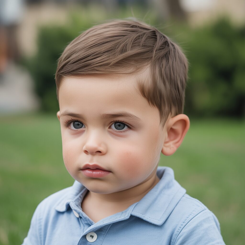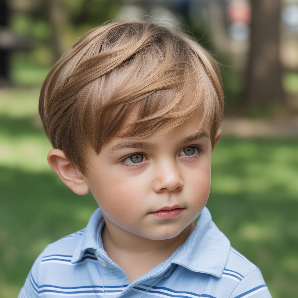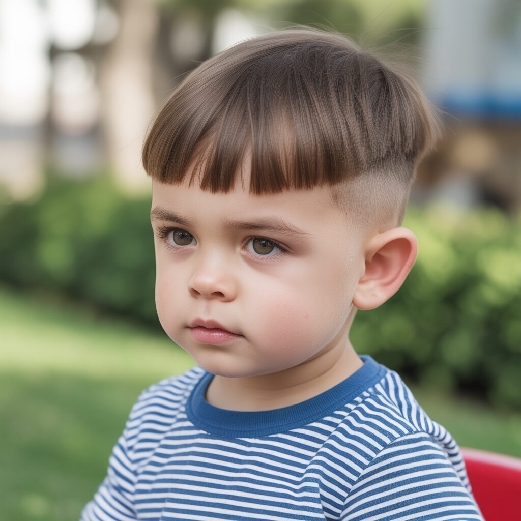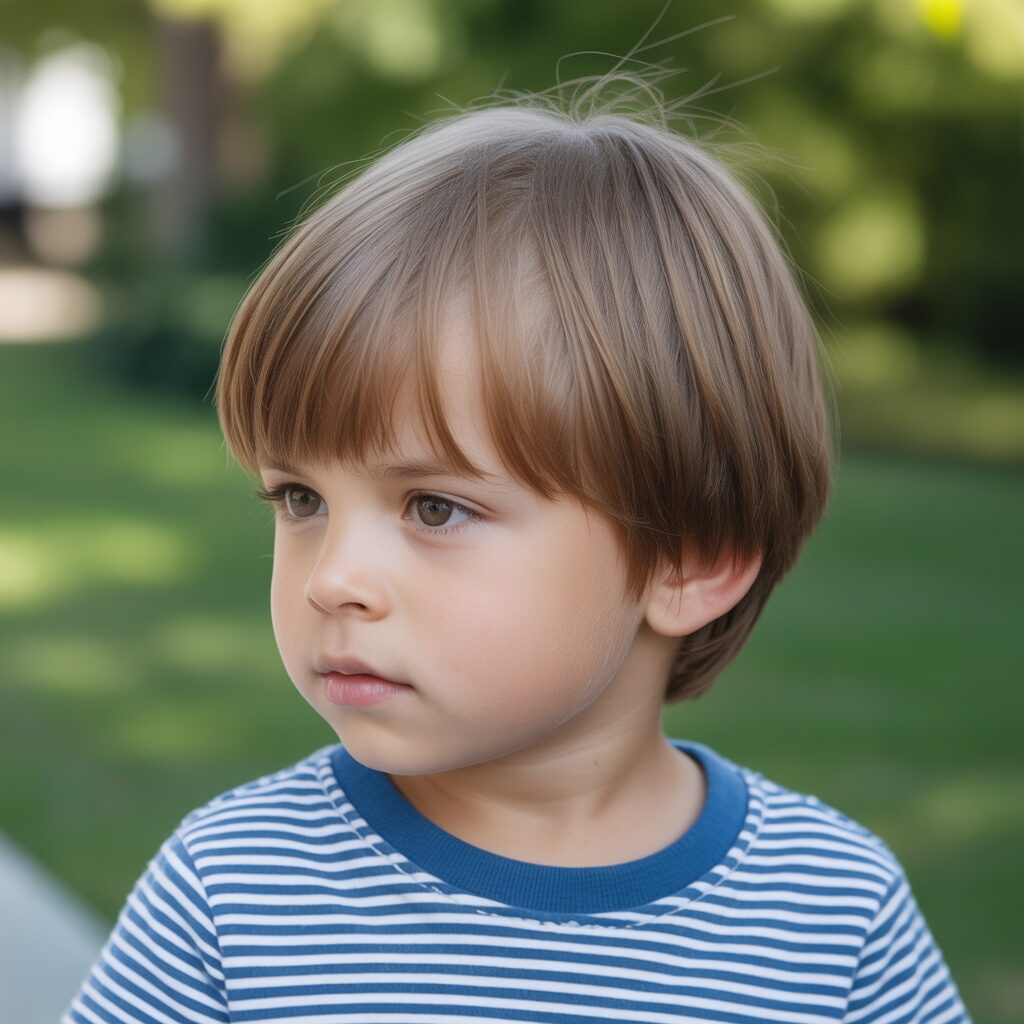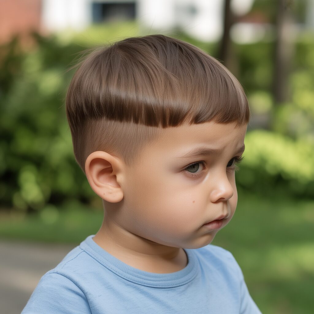 A short fringe helps frame the toddler’s face gently. It keeps hair away from the eyes. This haircut is best suited to straight hair. It looks neat without extra effort. It is comfortable and practical to wear.