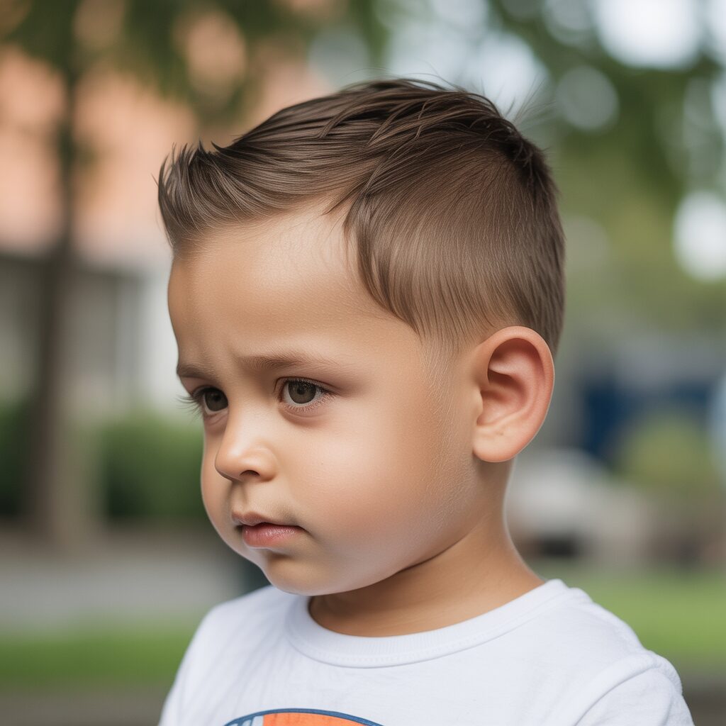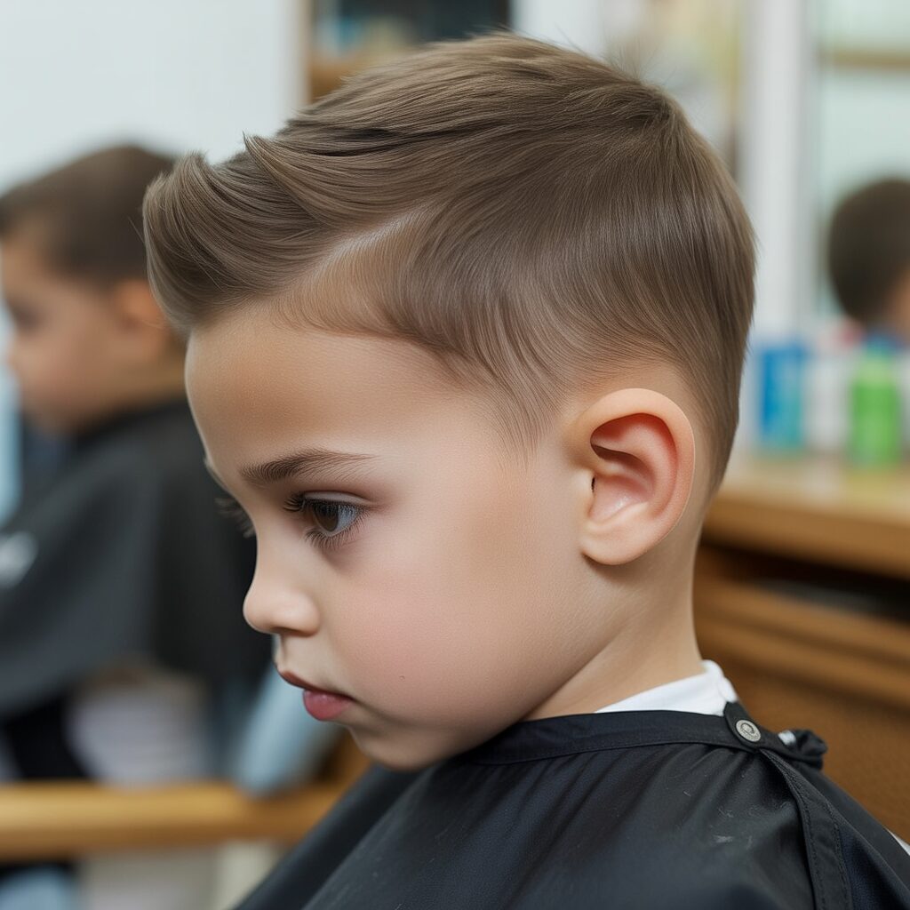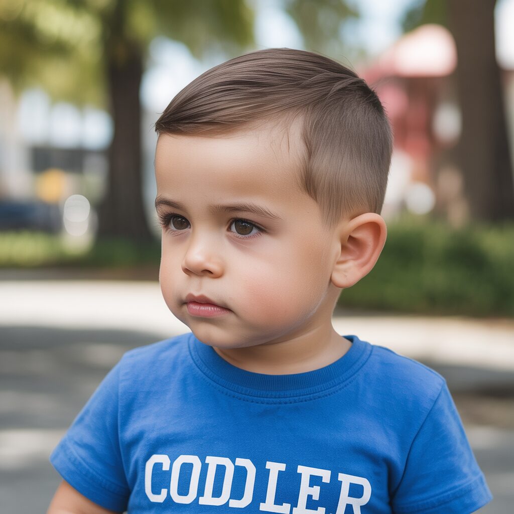Featuring a low fade that offers a soft and gentle transition from the top to the sides. This haircut looks neat without appearing too sharp. It is perfect for toddlers of smaller statures. It keeps the scalp comfortable and irritation-free. Parents love the neat look of the haircut.
