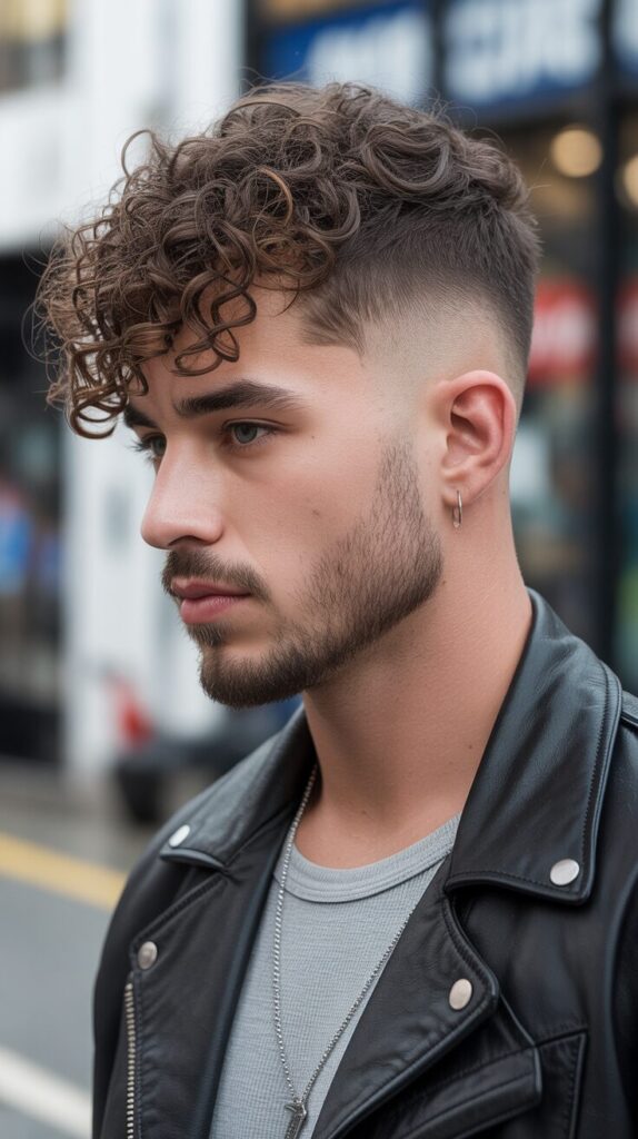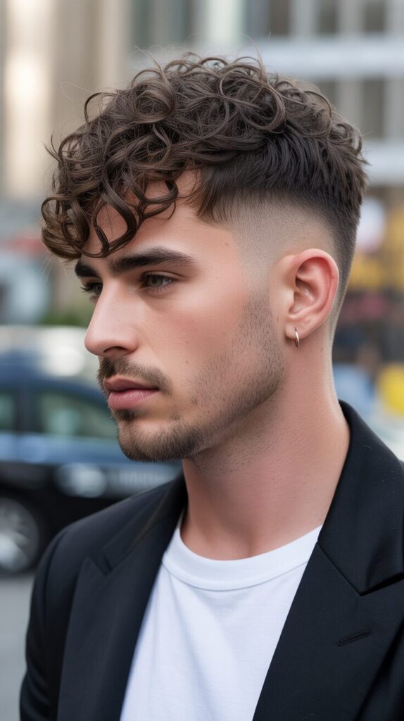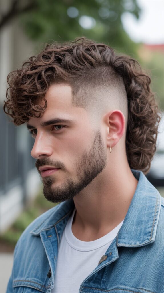 Embrace this curly mullet that is the perfect combination of curls and edge, elevated by a mid-skin fade for a contemporary and stylish look that epitomizes chic.