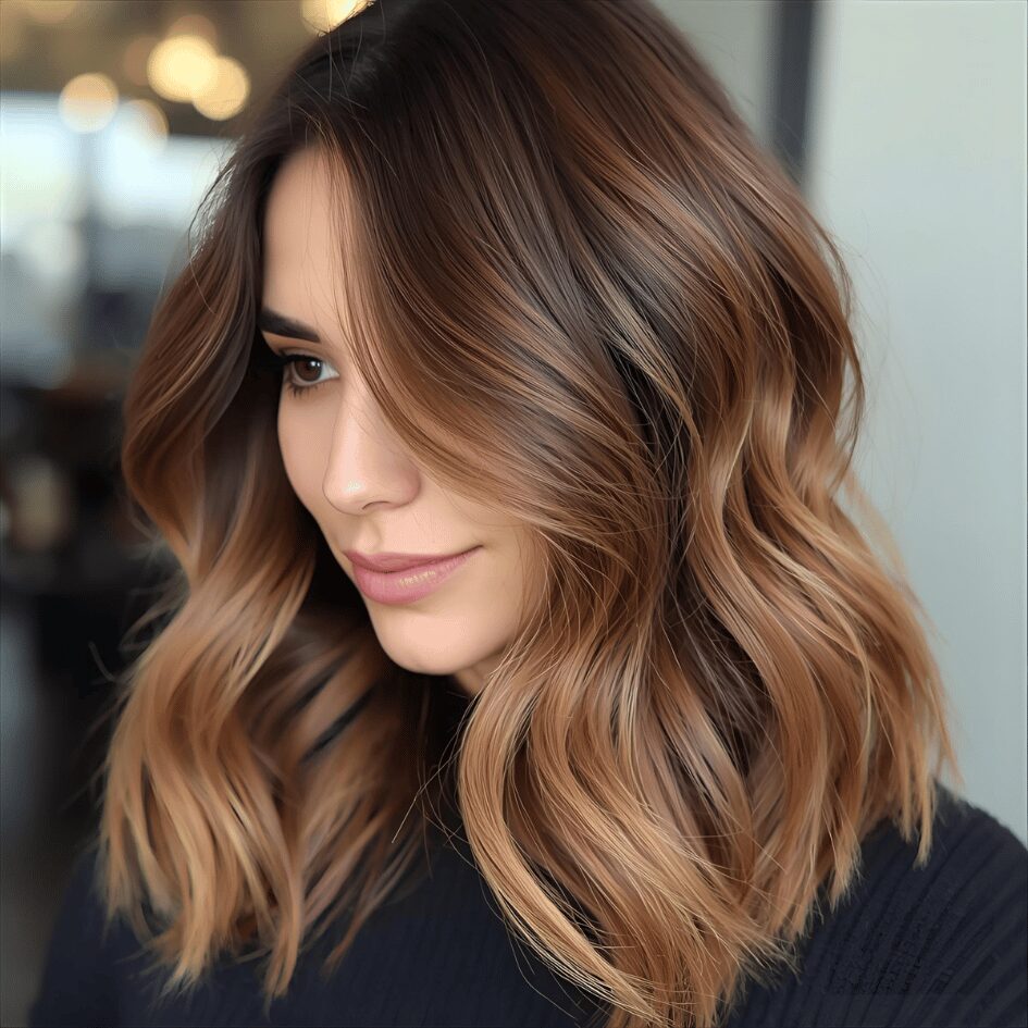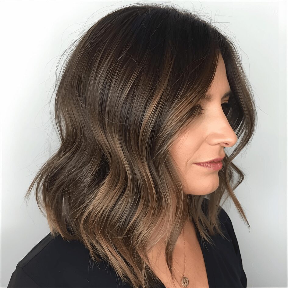 Adding caramel balayage to a layered hairstyle adds brightness without adding full color. It lifts the darker base gently. By adding volume, texture, and volume, this technique adds fullness and fullness to the hair. This technique grows out beautifully. Caramel tones flatter mature skin. Low upkeep and stylish.