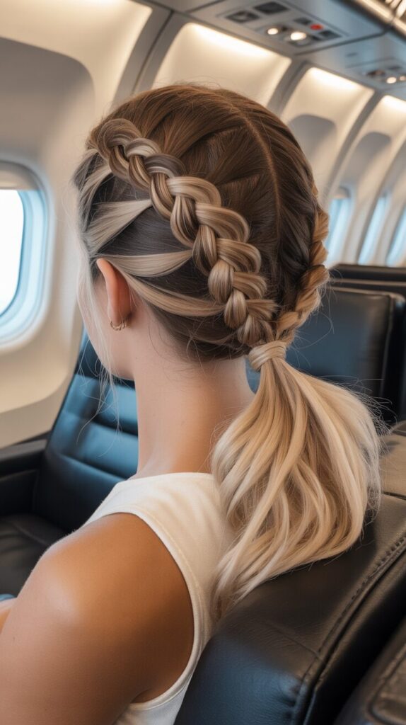 This style stays neat against travel pillows. It looks simple yet elegant. Perfect for overnight flights or international flights. A low ponytail styled with freehand braids offers comfort while sitting. The low positioning reduces neck pressure.