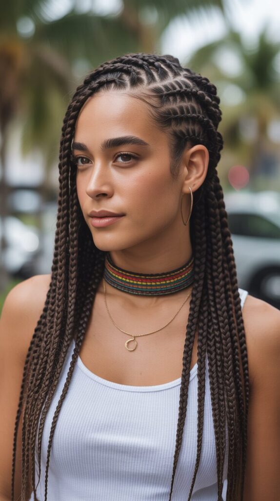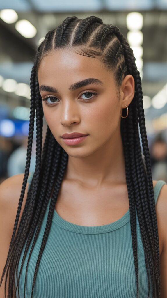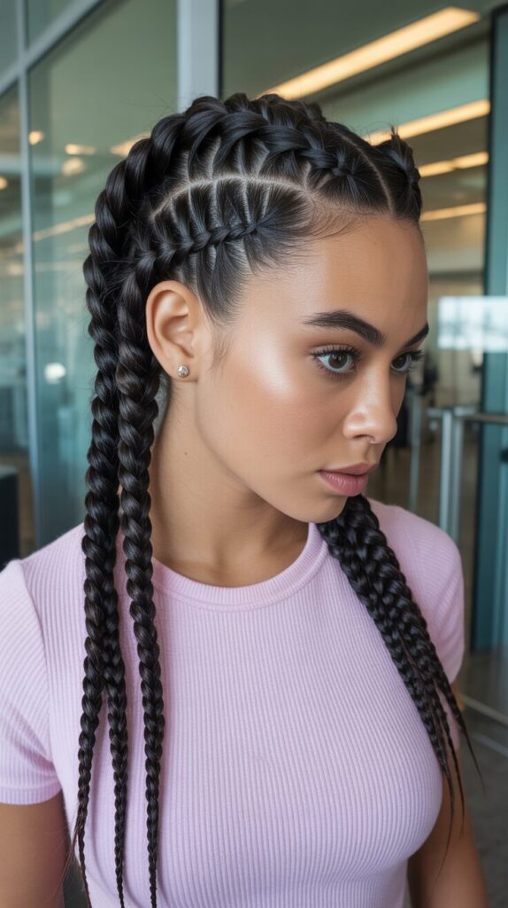 The combination of free-hand braids and sleek edges creates a sleek finish. The edges stay put for a polished appearance. This style stays fresh even after hours of travel and requires minimal touch-ups, making it perfect for airport photos and arrivals.
