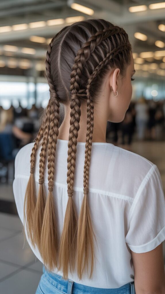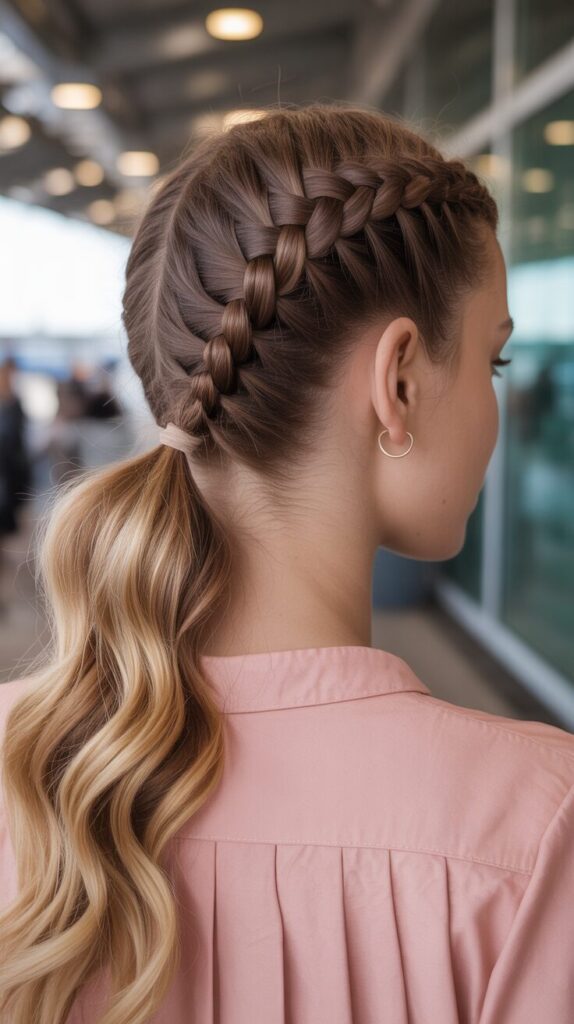 Freehand braided ponytails offer structure with convenience. The braids lead neatly into a secure ponytail. This style keeps hair off the neck and shoulders and is easy to manage while you are carrying bags or resting. It is a stylish yet practical haircut for airports.