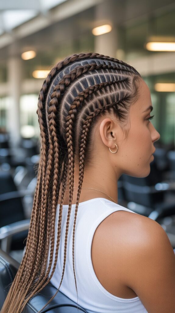 In addition to staying firm and neat, classical freehand cornrows are ideal for airport travel. They are lightweight and comfortable to wear all day, and the scalp-close braiding keeps the hair secure during long flights. This style reduces friction and dryness caused by air travel. Cornrows are also a clean and timeless travel-ready style, and they can be worn during the day.