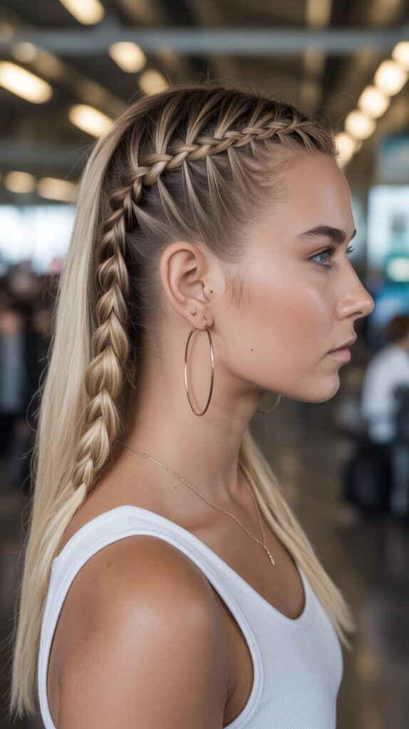 This freehand side-part braided hairstyle adds style while staying travel-friendly. The side design creates a modern look that keeps the hair in control during movement. This hairstyle also stays neat during check-ins and waits. It is perfect for travelers who desire both style and function.