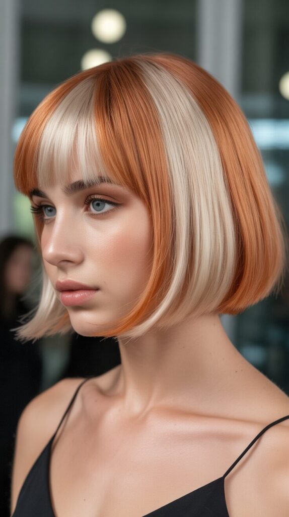 Copper and Pearl Blonde Gemini Hair on Bob Cut With Choppy Bangs