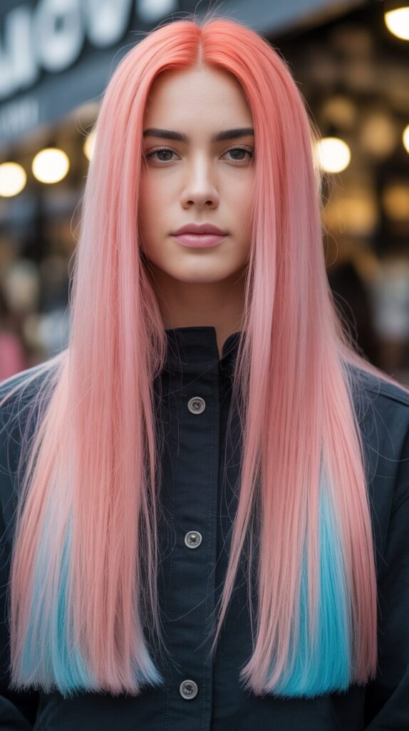 The cotton candy looks so pretty in these long and straight hair. It enhances the smoothness of the straight hair with coral blue and lemonade pink shades. Although both shades are quite daring, they complement one another and are soothing to the eye. This Gemini hairstyle is quite daring, yet it has a sophisticated edge.