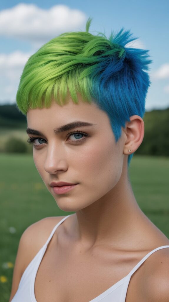 One of the best things about Gemini hairstyles is that they look stunning with any haircut. Whether you have a wolf cut or a pixie cut, you can adopt the Gemini hairstyle to completely change how you look. There is so much fun and energy in this pixie cut as it is bright lime green and true blue with the choppy micro bangs. I think the green pastures and the beautiful blue sky are blending together so well. Is that your opinion?