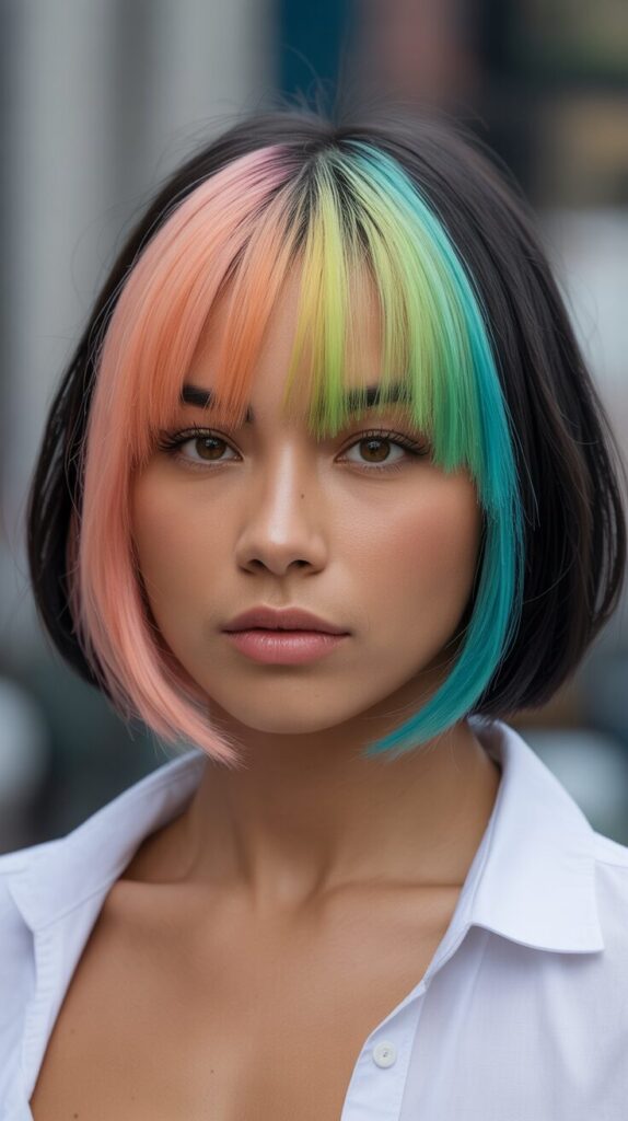With Gemini hair, there is no shortage of innovation, and this colorful bob cut is a perfect example of that. This look comprises half natural black hair and half multi-shade hair (peach, pink, neon green, yellow, teal). Don’t you think the multi-shade side looks like a Tropical Prism?