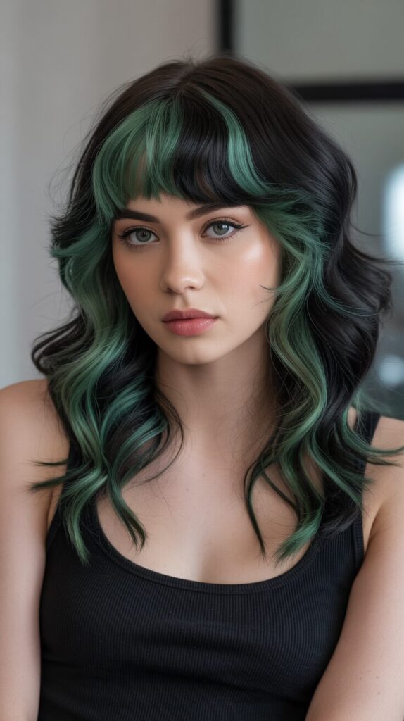 Black and Emerald Wavy Gemini Hair with Blunt Micro Bangs