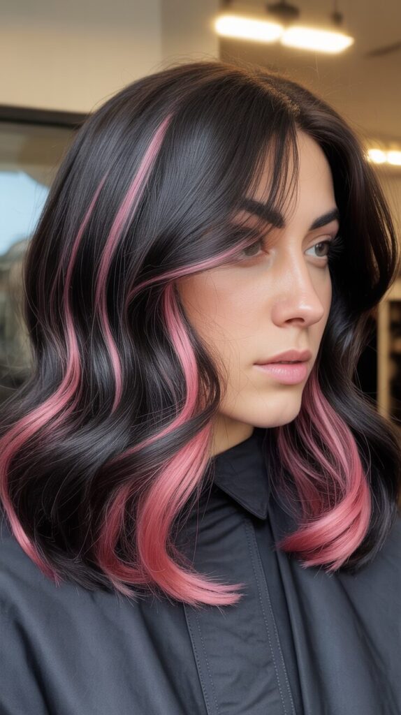 Having a medium-length haircut like this can add a lot of eye-catching elements to your hairstyle. These include the glossy black colors, the wild orchid pink shades, and some chunky pink highlights on your hair tips. We really like the subtlety of this Gemini hairstyle as well as the smooth texture.