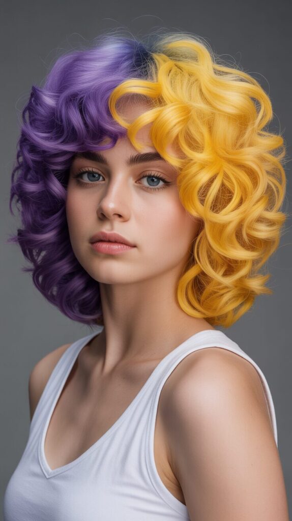 Gemini Medium Curly Yellow and Iris Purple Hair