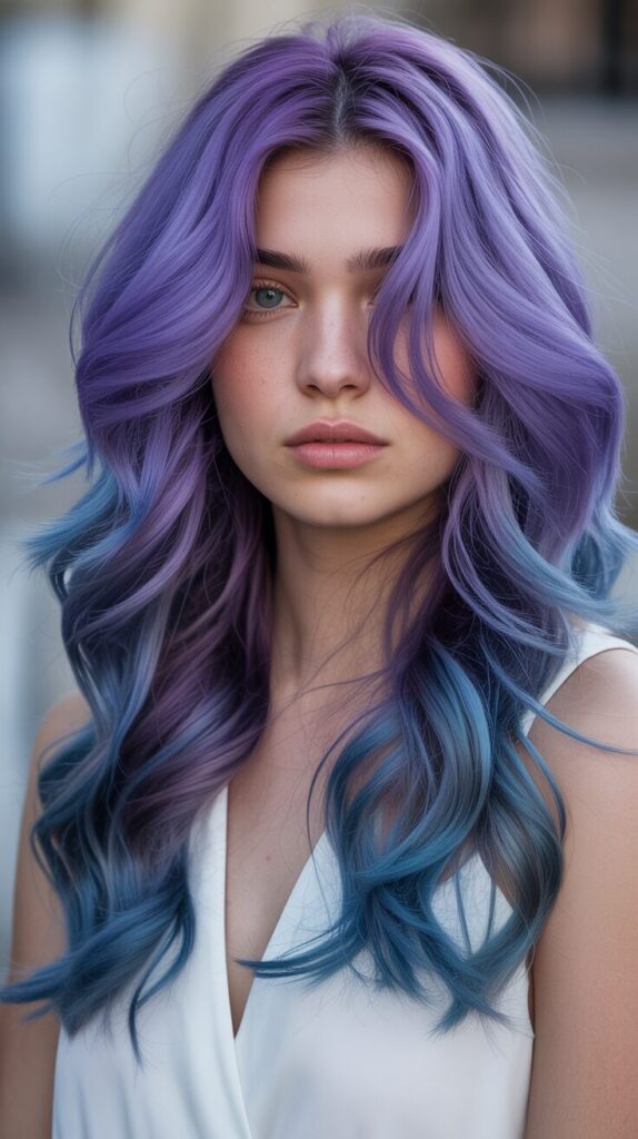 As soon as we saw this stunning combination of amethyst purple and sky blue shades, we were taken back to the mysterious twilight of the sun. The magical and mysterious blending of these two beautiful shades looks even more stunning in these long layered and wavy locks. Remember the sky at dusk? This Gemini hair look is the perfect answer.