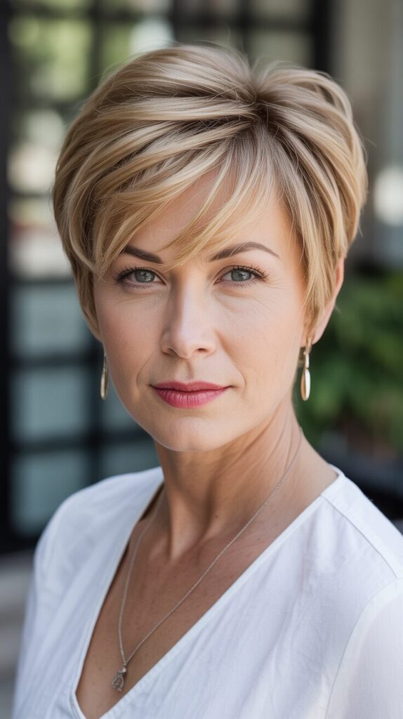 14. Side-Swept Pixie with Long Bangs for Women Over 50 with Round Faces