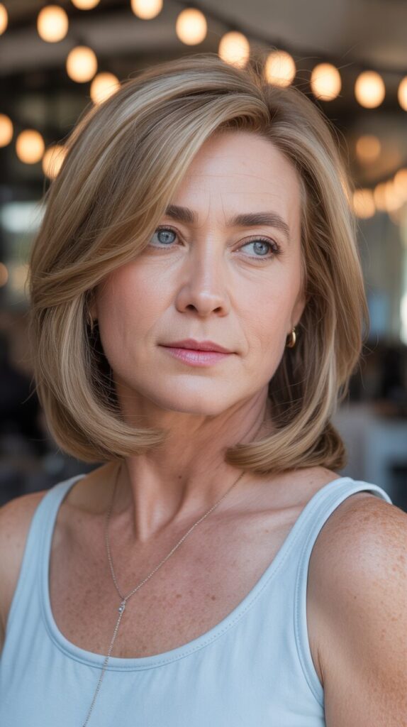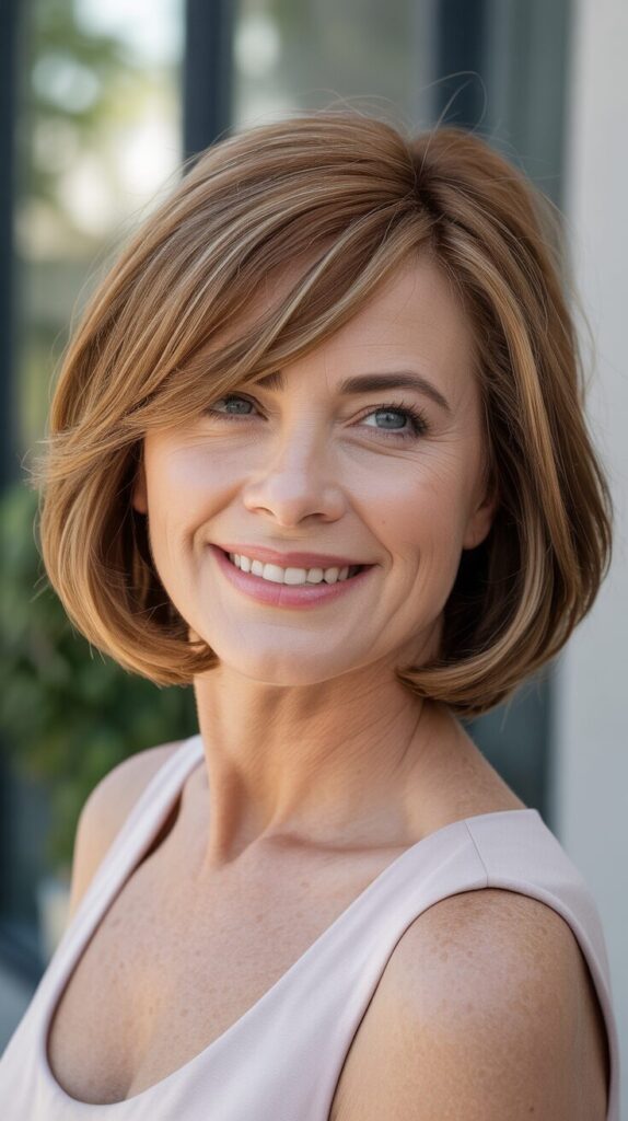 4. Long Bob (Lob) with Side-Swept Bangs for Women Over 50 with Round Faces