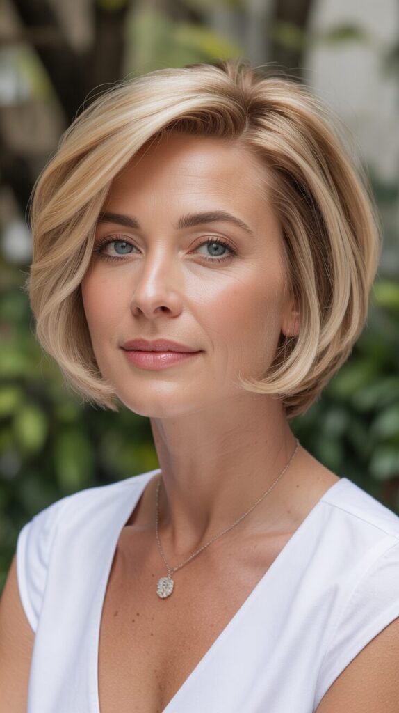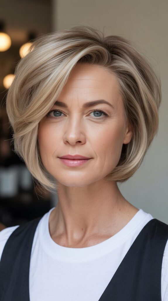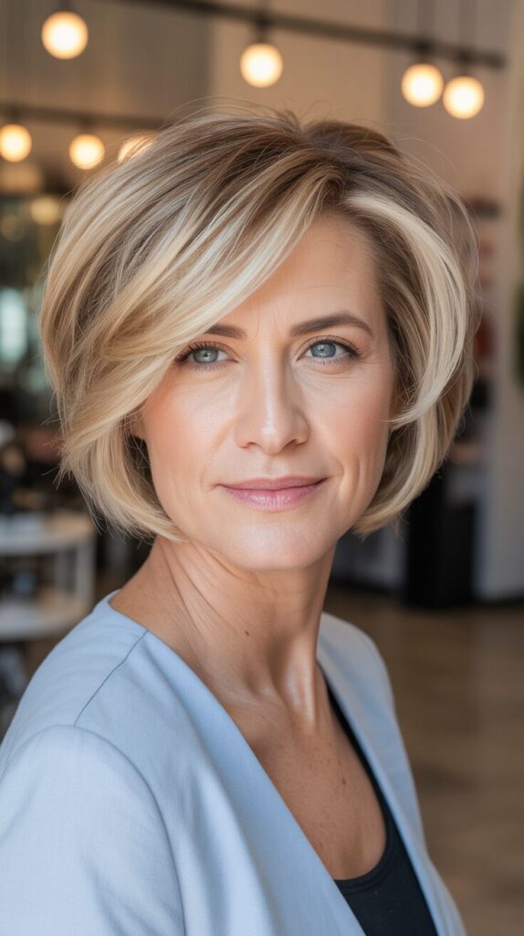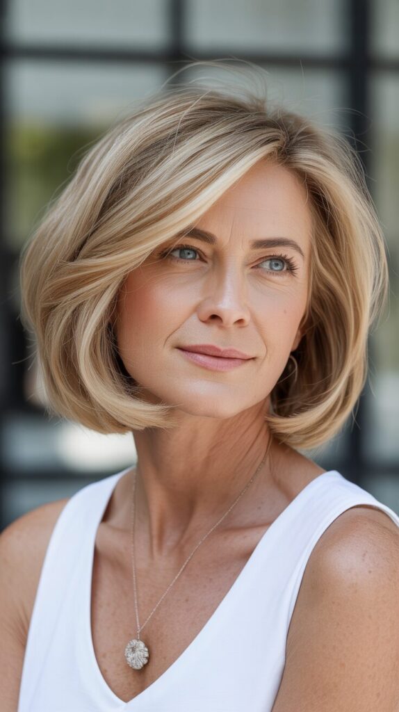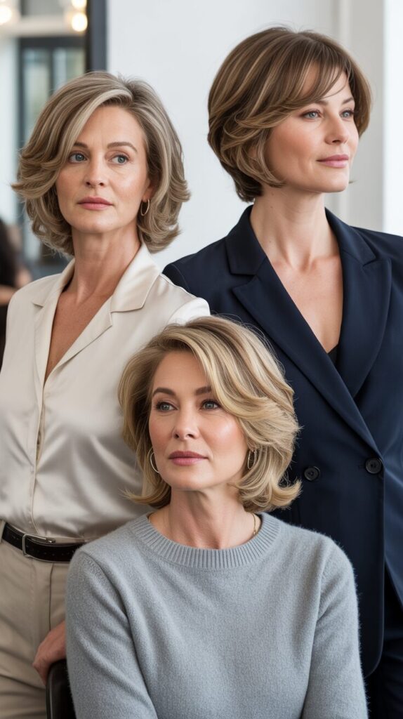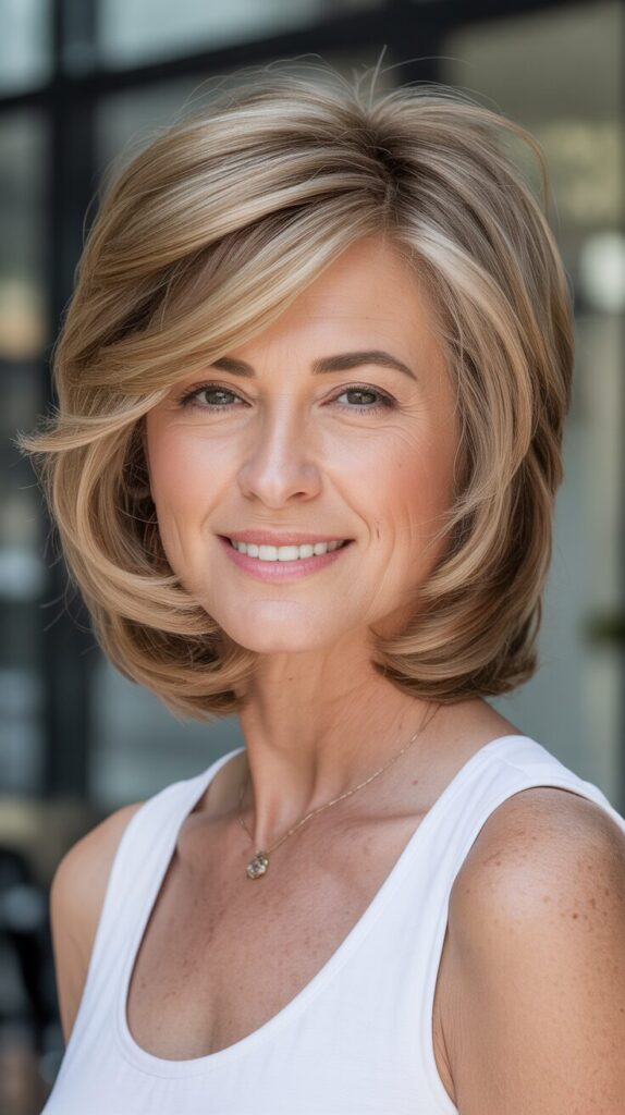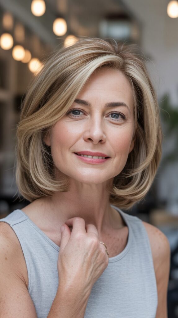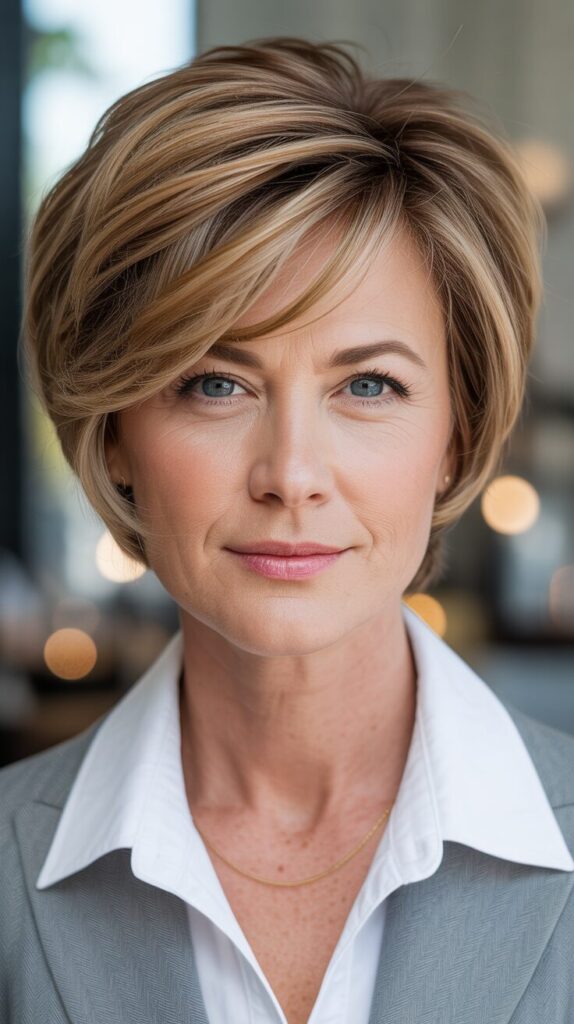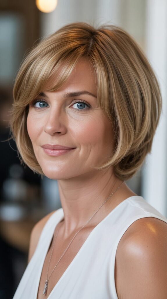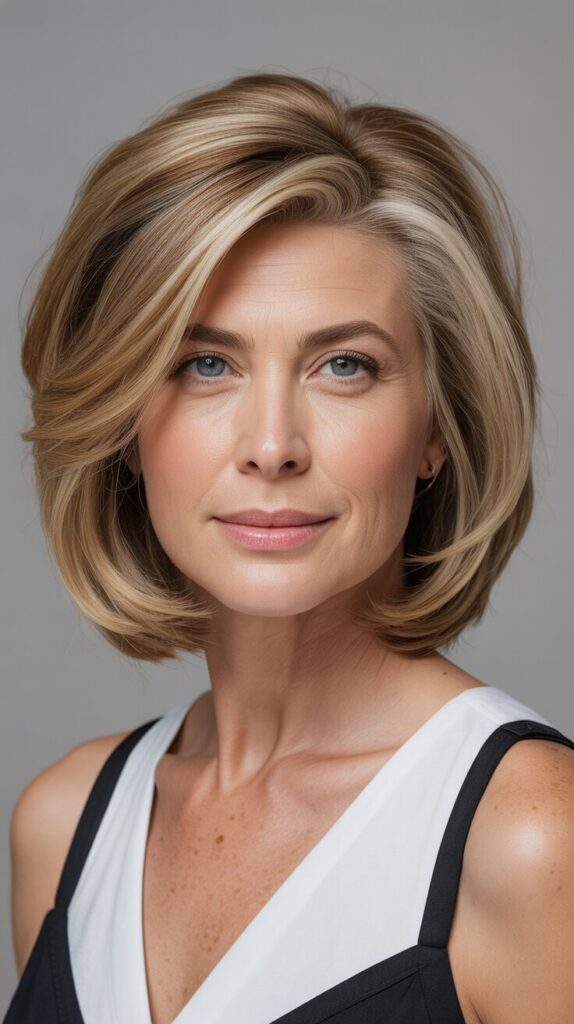 Layers lift the crown while highlights add dimension. Styling with light mousse or volumizing spray enhances natural movement. In addition to adding depth, subtle highlights create the illusion of fuller hair. This haircut combines sophistication with modern flair, making it perfect for women who want a professional, low-maintenance look.